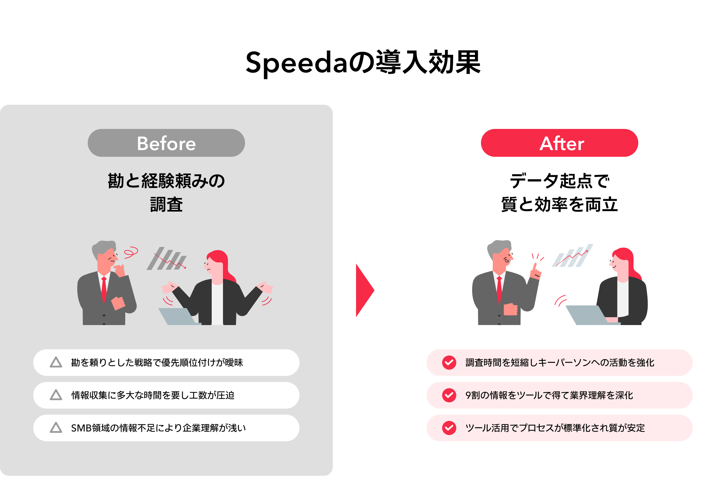 櫻井氏:先述の通り、特にエンタープライズセールスにおいては「業界(市場)・部署・人物」の3つすべてを理解することが重要なのですが、ひとつめの「業界理解」については、スピーダ 営業リサーチを利用することで、かなり時間・工数を削減できたと思っています。そのぶん、重要度の高い部署や人物に関する調査により多くのリソースを投入できることは、大きなインパクトがありますね。