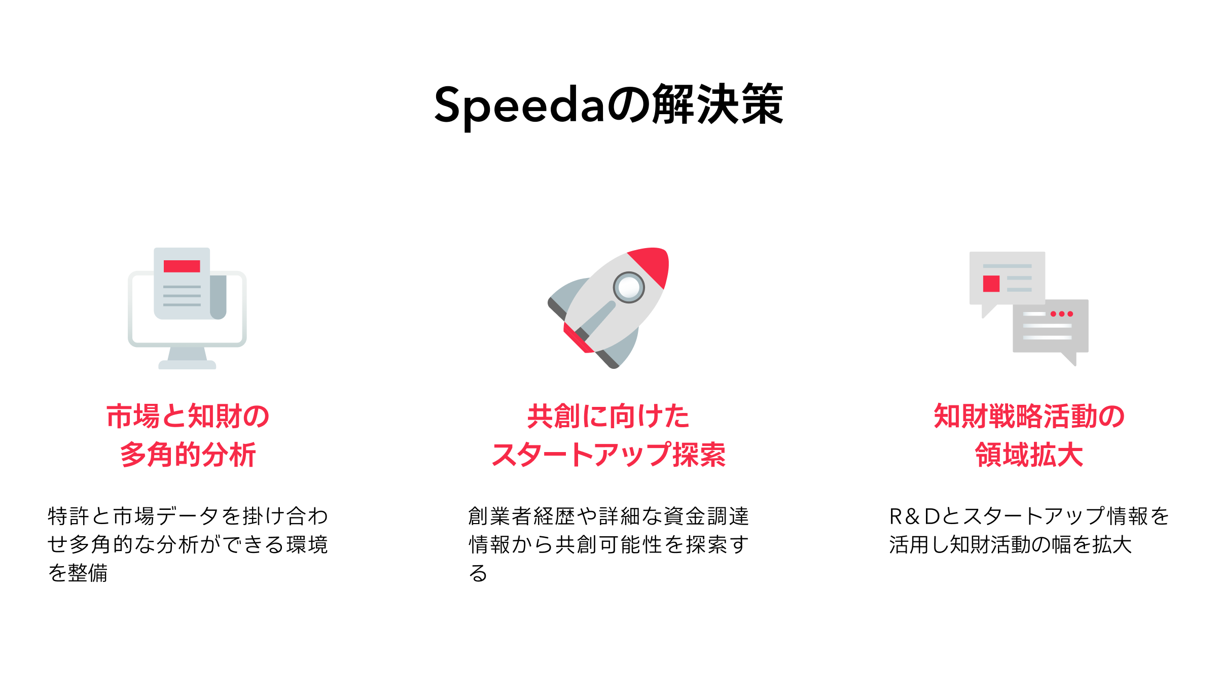そのためにも、スピーダ R&D分析とスピーダ スタートアップ情報リサーチのどちらか単体ではなく、両方を活用しながら幅広く情報収集することが必要です。