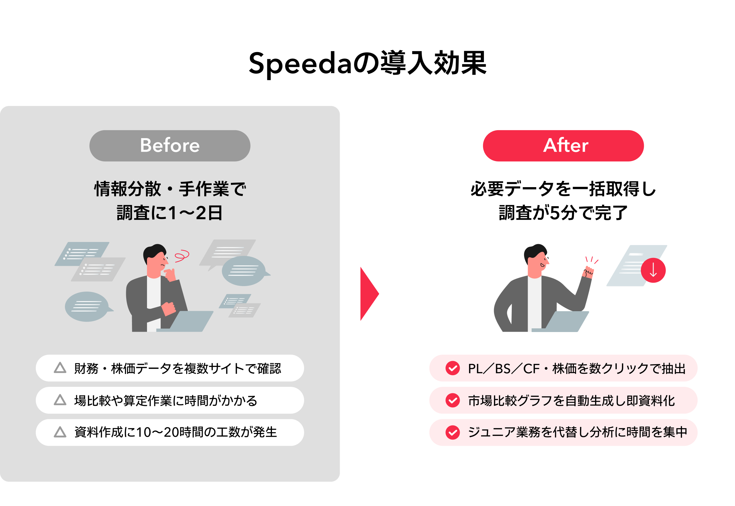 情報収集にかかる時間が、劇的に短縮されました。たとえば、企業の財務情報やマーケットデータを個別に収集・整理し、提案資料を作成するには、従来の方法では1〜2日(作業時間として約10〜20時間)を要することもあります。投資銀行時代にはEDINETや各社の開示情報を1件ずつ手作業で調べていたこともあり「非効率で発狂しそうだ」と感じたこともありましたが(笑)、Speedaを活用すれば、こうした作業はわずか5分で完了します。