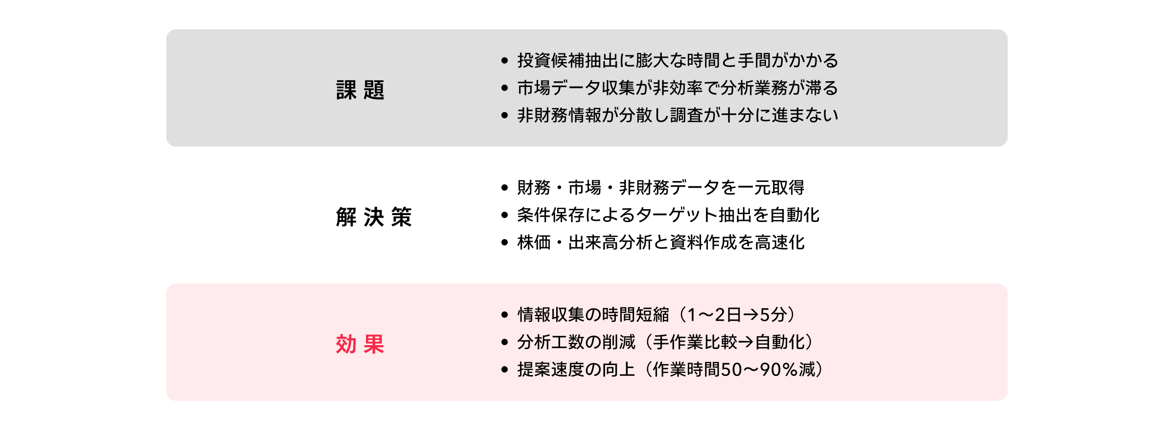 こうした情報収集の“非効率”は、投資機会の探索、リスク評価、顧客向けの提案に至るまで、業務全体のスピードや質に影響を及ぼす要因になります。