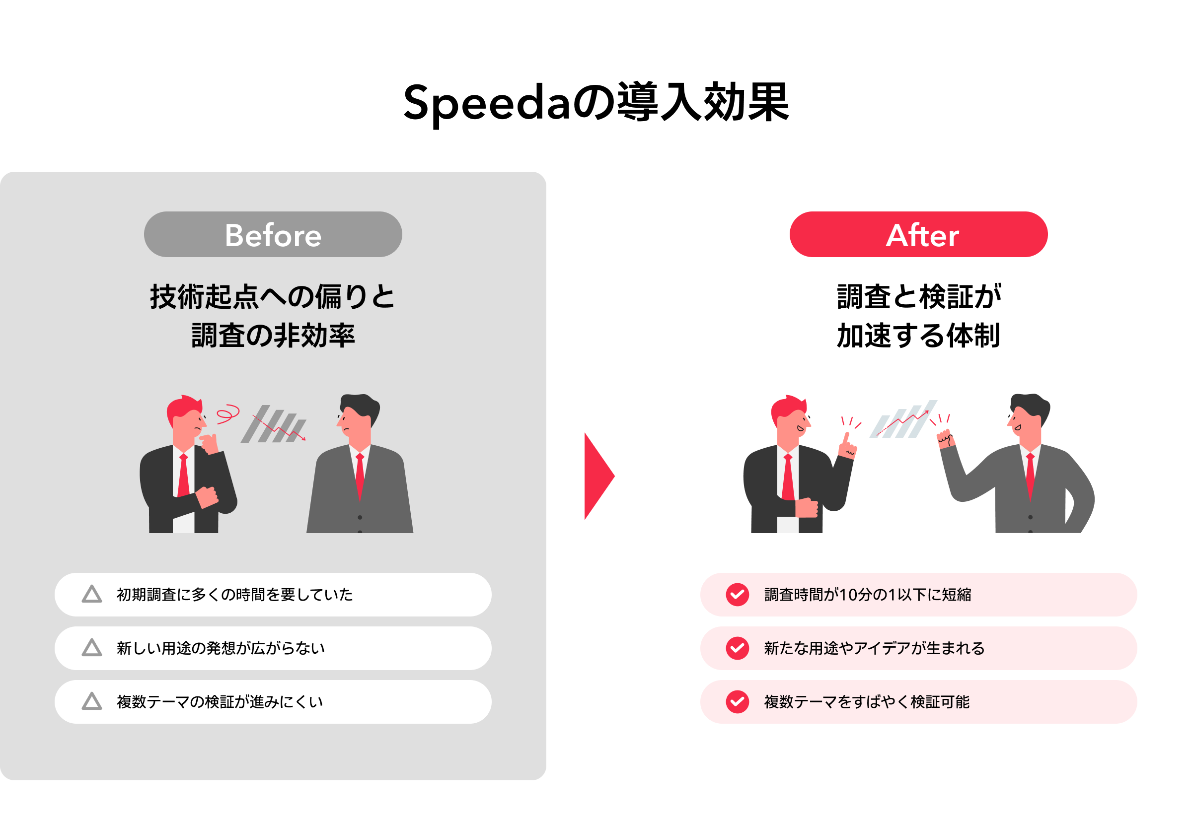 こうしたスピーダのグラフや図をダウンロードして社内資料に盛り込み、チームでの共有・ディスカッションに利用しています。スピーダ独自の質の高いトレンドレポートを中心に議論することで、1人では気づけなかった新たな用途やアイデアが生まれます。