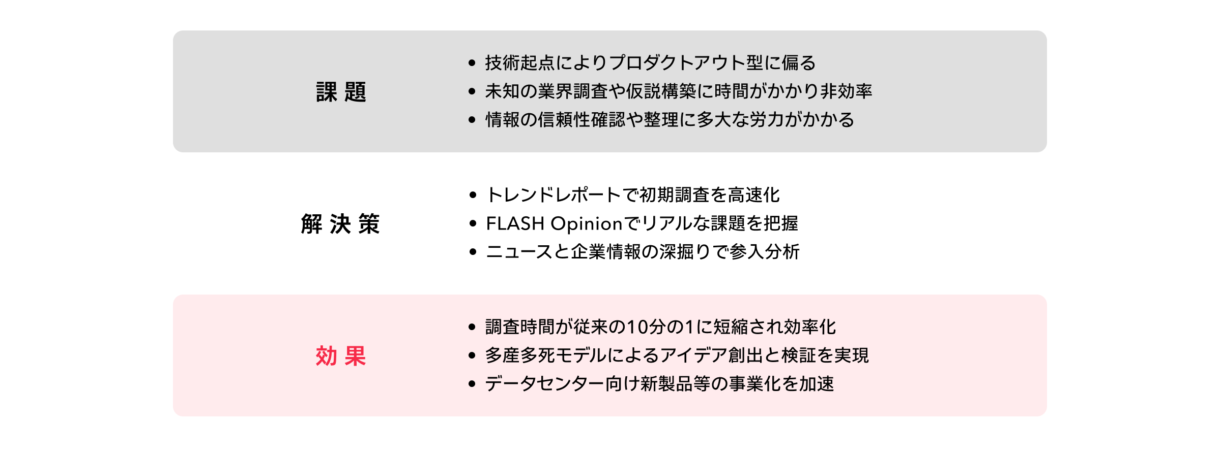 また、専門家への質問と回答文が蓄積されているFLASH Opinionでは、各業界のリアルな課題に触れられるため、アイデアを検証する際のヒントが得られます。企業情報、トレンドレポート、ニュースと多種多様な情報が一元的に収集できる構造になっているので、最近では「まずはスピーダ R&D分析を使おう」と考えるようになりました。