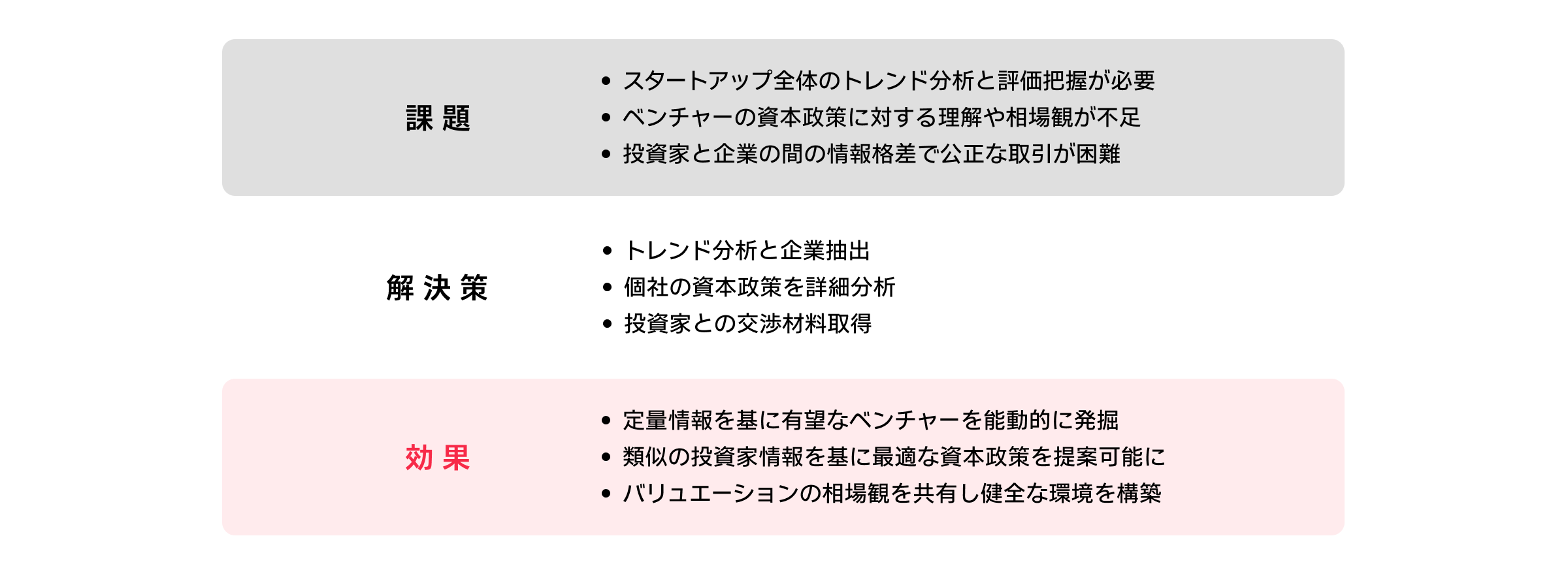 また、ベンチャーファイナンスに慣れていない大企業の新規事業担当者に相場観を説明する際にも役立っています。