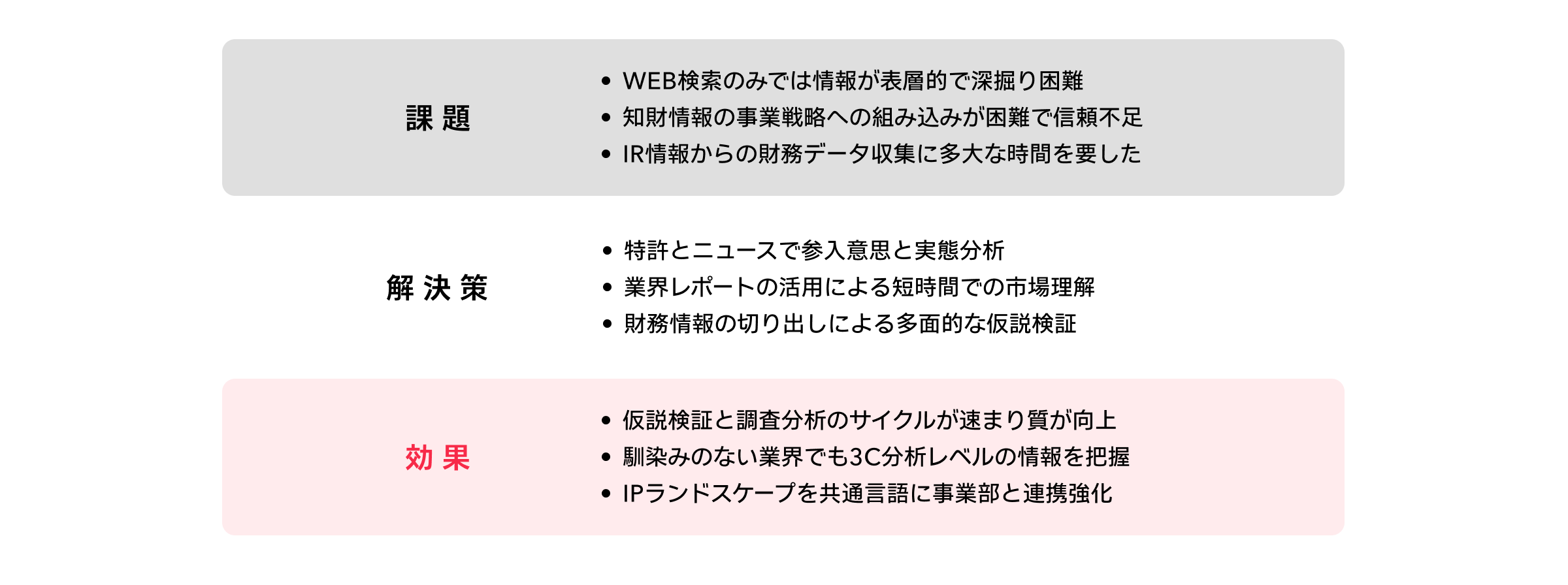 スピーダ導入後の約2年半の変化を総合的に振り返ると、仕事の質が変わったことが最も大きな変化です。IPランドスケープでは仮説検証が欠かせません。立てた仮説をもとに、調査を実施しその調査を分析する。さらにその分析をもとに新たな仮説を立て、調査分析を行う。このサイクルが明らかに速まり、仮説検証の質が高まっています。この背景には、情報を深掘りしやすくなったことがあると感じています。導入前はWEB検索による表層的な情報に留まっていたものが、スピーダを活用することによって、検証に利用できる情報が増え、より多面的な角度から仮説検証を行えるようになりました。