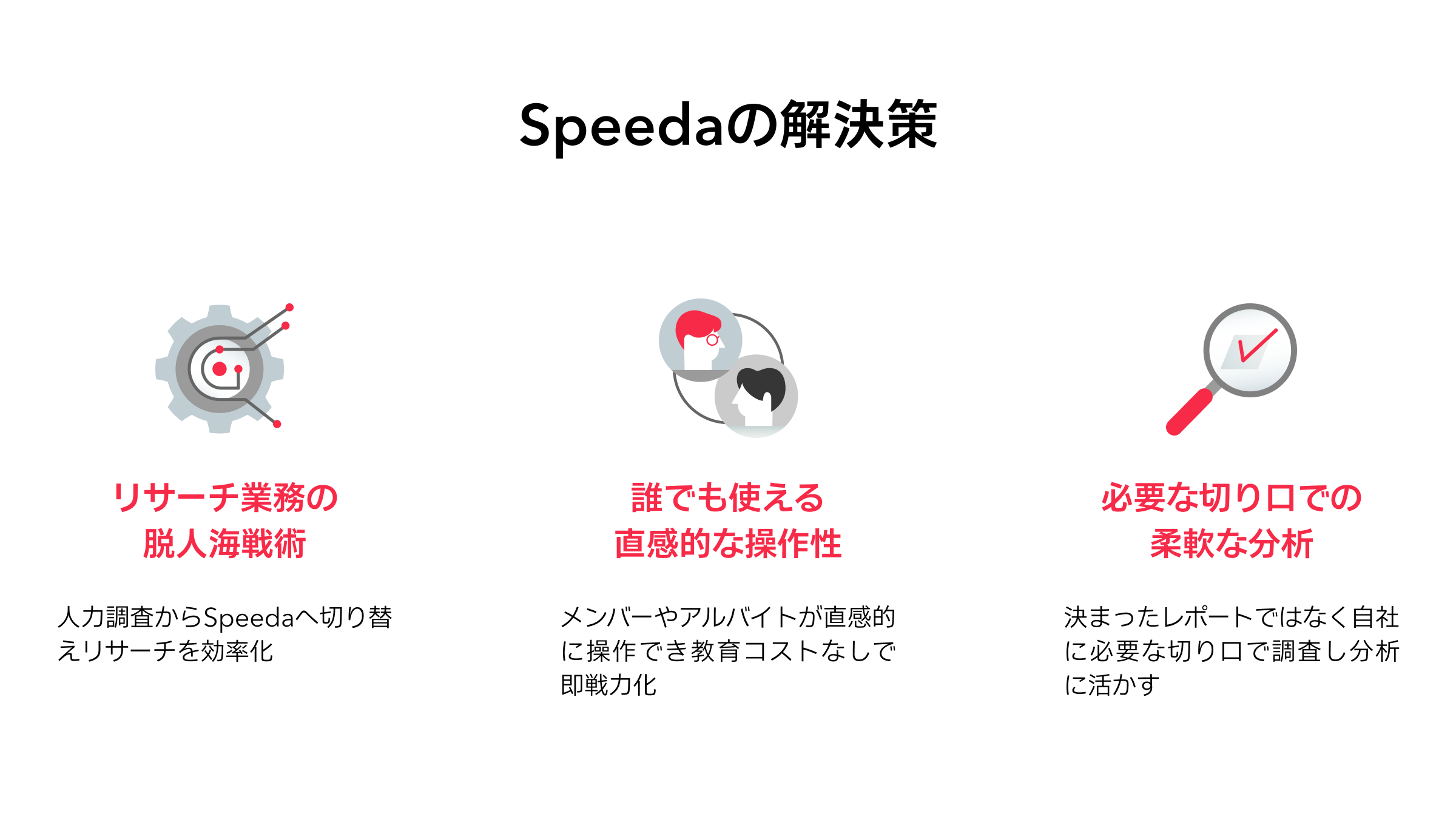 いいえ、明確な比較はしませんでした。ただ、さまざまな調査会社がありますが、それらとの違いを意識はしていました。違いは2つあって、1つは、調査会社から入手する情報は、分厚いレポートという形式をとっており、必要のない情報が盛り込まれている感覚がありました。その意味では、SPEEDAとの直接競合、類似サービスはないという認識でした。