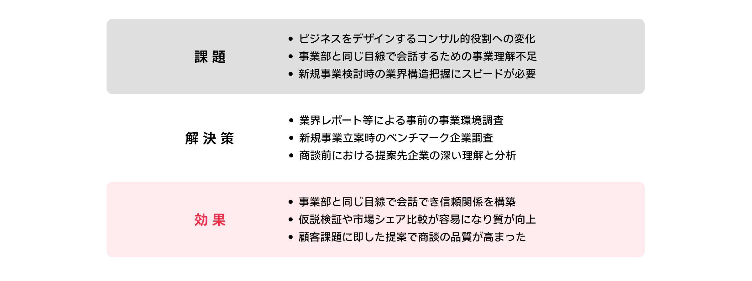 それまでは、事業部の人たちに直接ヒアリングして業界や競合の情報を集めていました。事業部にいる詳しい人に集まっていただき、こちらが作成したヒアリング項目に沿って根掘り葉掘り質問する。そうしてビジネスを理解するように努めていました。