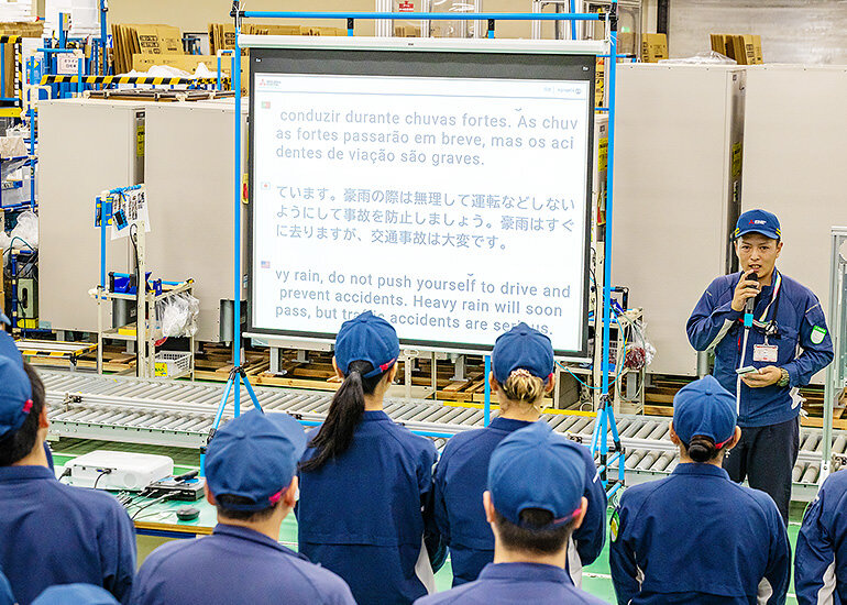 ディスプレイに伝達事項を多言語で表示する「MelBridge®翻訳サイネージ™」。生産現場で外国人スタッフとの円滑なコミュニケーションが可能となる