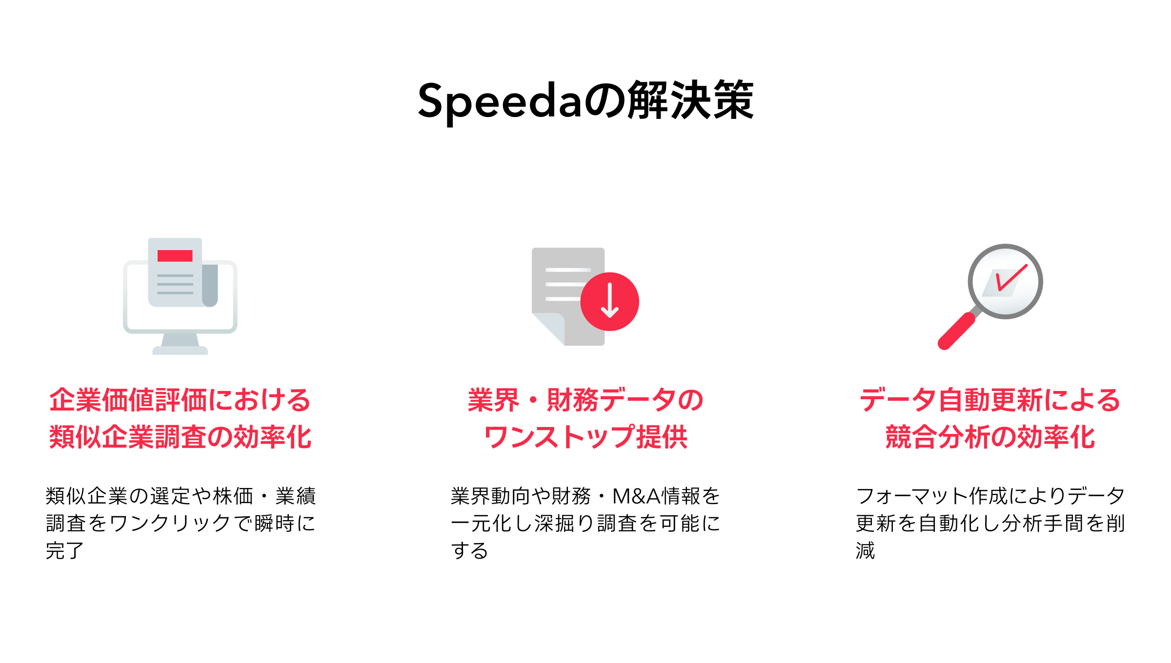 スピーダの良さは、多様な業界の現状を知れるだけでなく、そこから各企業の財務やM&A情報、ニュース、Web サイトなどに辿りつけることだと思っています。つまり、データが1箇所にまとまっていることが優れている点です。データの鮮度もいいですよね。