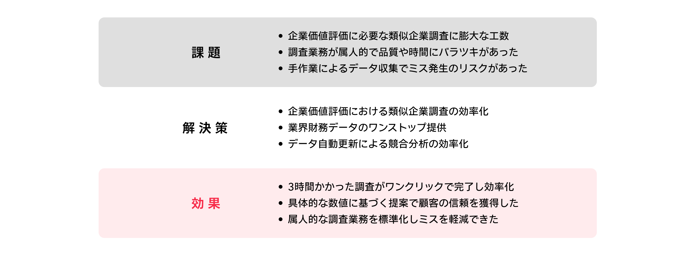 一番の課題は『企業価値評価』の手間でした。未上場企業の価値を評価する時、類似のビジネスを行っている上場企業の業績を参考にすることが多くあります。その際に、比較対象を選定し、株価や業績を調べなくてはならない。20社ほど調べるだけでも、ものすごい時間がかかるんです。