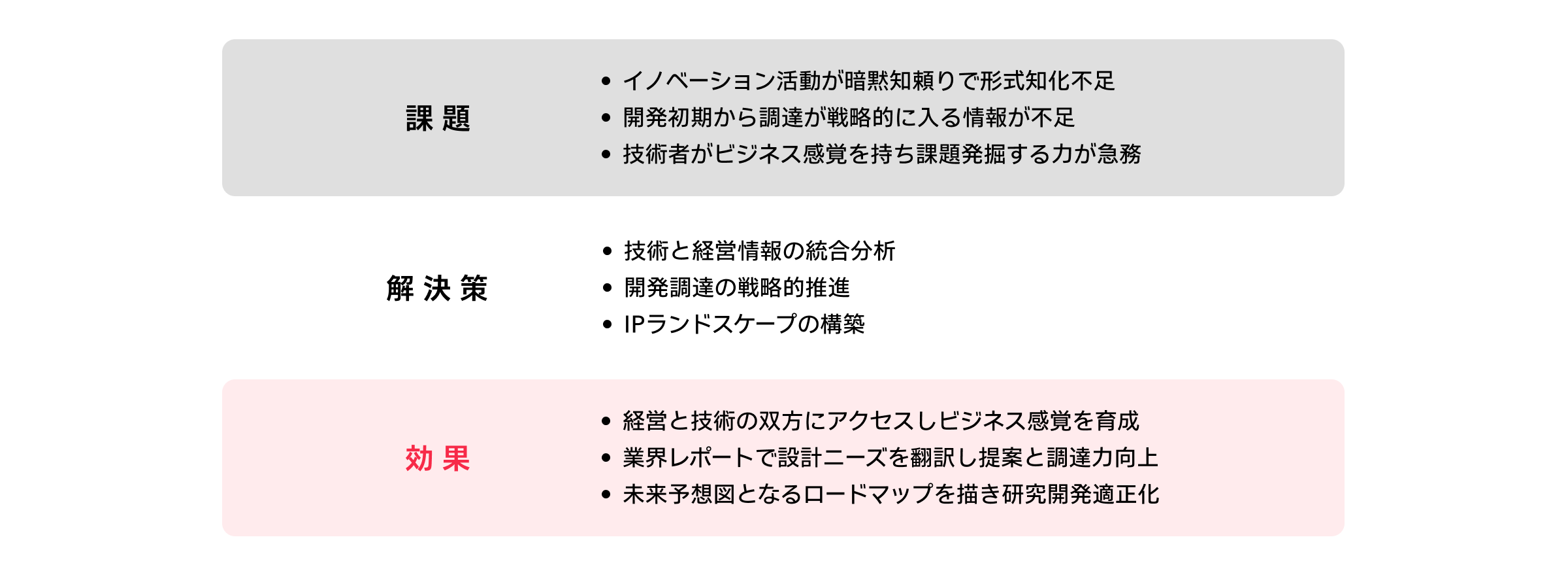 山崎様:スピーダを使うことで、未来予想図となるロードマップを描くIPランドスケープができたという実感はあります。これぞ進めていくべき研究開発の王道というものを、ある程度、構築できたのではないかと思います。