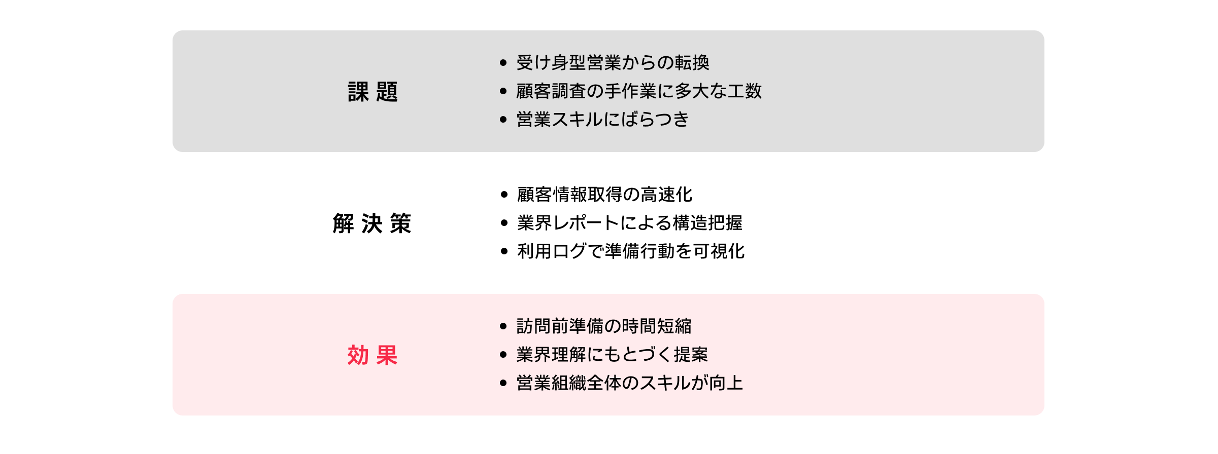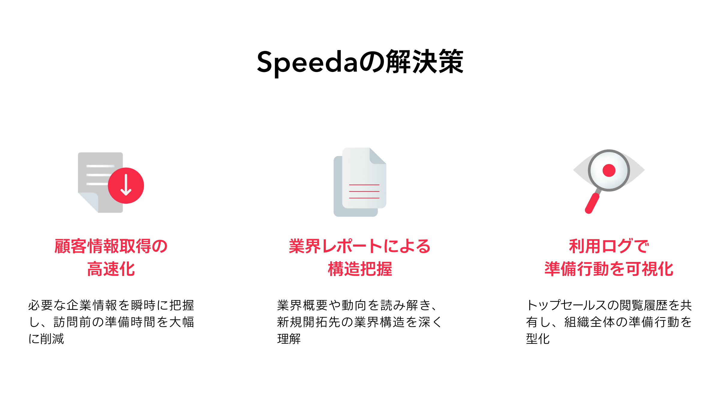 そのための大前提として重要なのがお客様を知ること。そしてお客様のお客様を知ること。でも「調べること」に時間を割いていたのでは、最も重要な「考えること」に時間を使えなくなります。だから、情報を効率的かつ確実に抑えるためのツールとして、スピーダ 営業リサーチは不可欠でした。