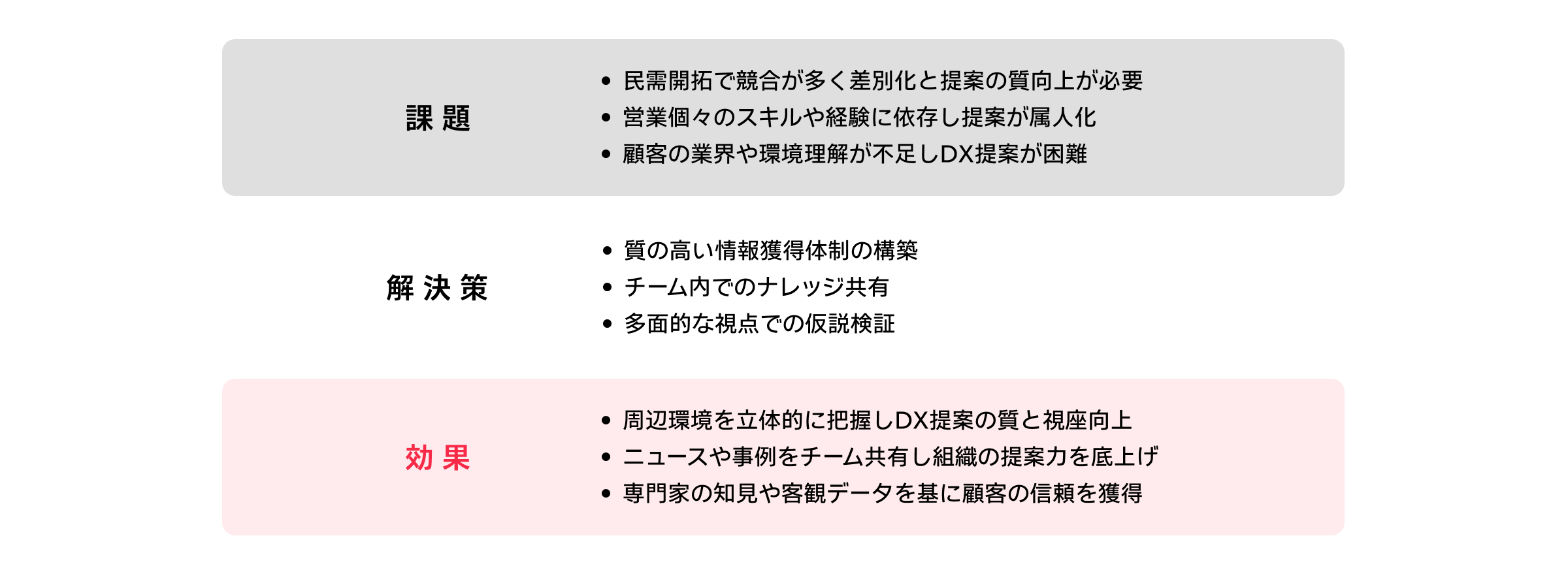 1つ目の課題は、そもそも民需ユーザーへのDX提案は各社が力を入れており、競合が非常に多い環境であること。我々はこれまで公共重視のビジネスを展開してきたこともあり、わたしたちが今後担いたい立場ですでにビジネスをされてきた競合企業が多くいます。
