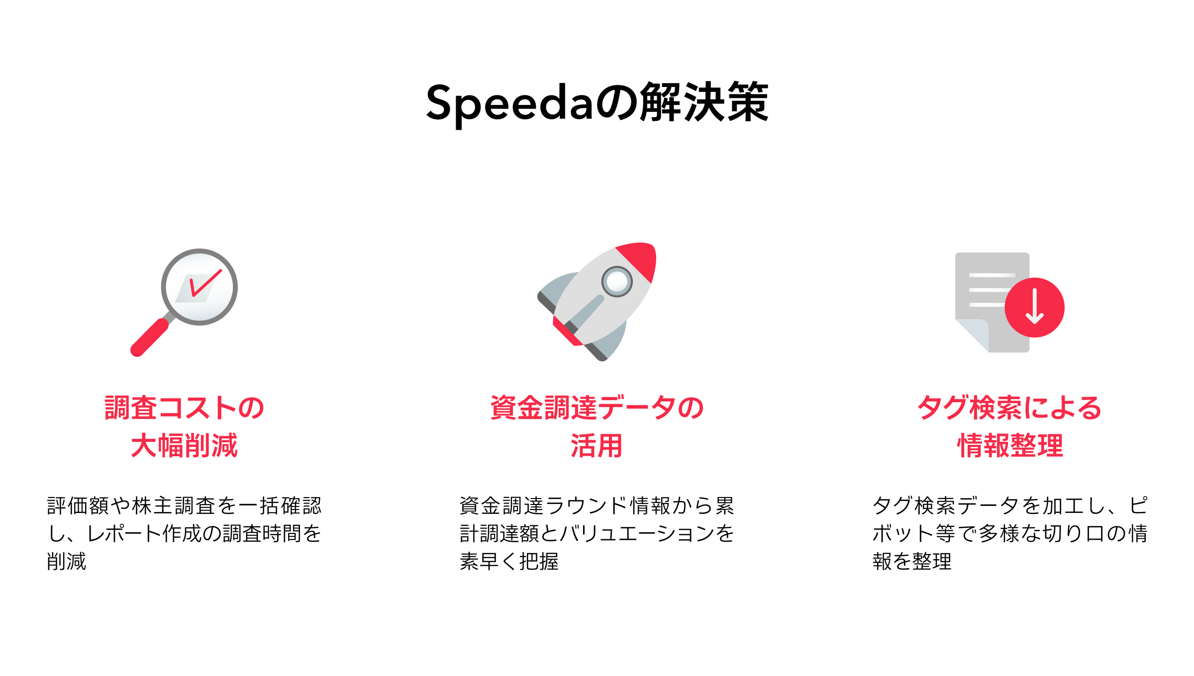 三好様: 膨大なデータを扱うシーンにおいても、検索結果が得られるまでの速度がさらに高まることを期待しています。また他のSaaSが実装しているようなChromeプラグインもあれば便利かもしれません。スピーダ スタートアップ情報リサーチは資金調達にフォーカスした機能が充実している印象を持っていますが、IPOやM&A情報のリサーチコスト削減の観点からは、「Exit検索」の機能もあれば嬉しいです。