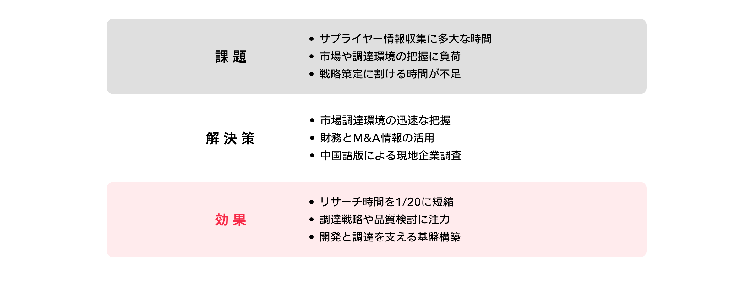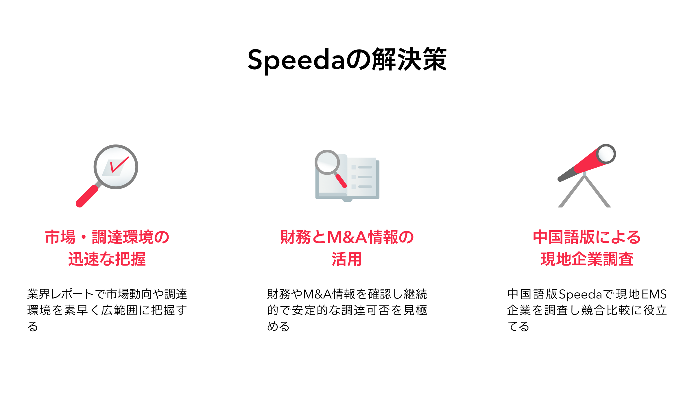 また、中国各地に調達拠点があるため中国語版スピーダも現地で導入しているため、現地のEMS(設計・製造受託)に製造を依頼するため企業を調査し競合比較することもあります。現在はマルチソースで情報収集することを心がけています。スピーダからは「いま」の全体感をとらえる情報を、コンサルティングファームからは彼らが足で稼いできたリアルな情報を、そしてリサーチファームからは専門的な部品メーカーについての情報を取得しています。