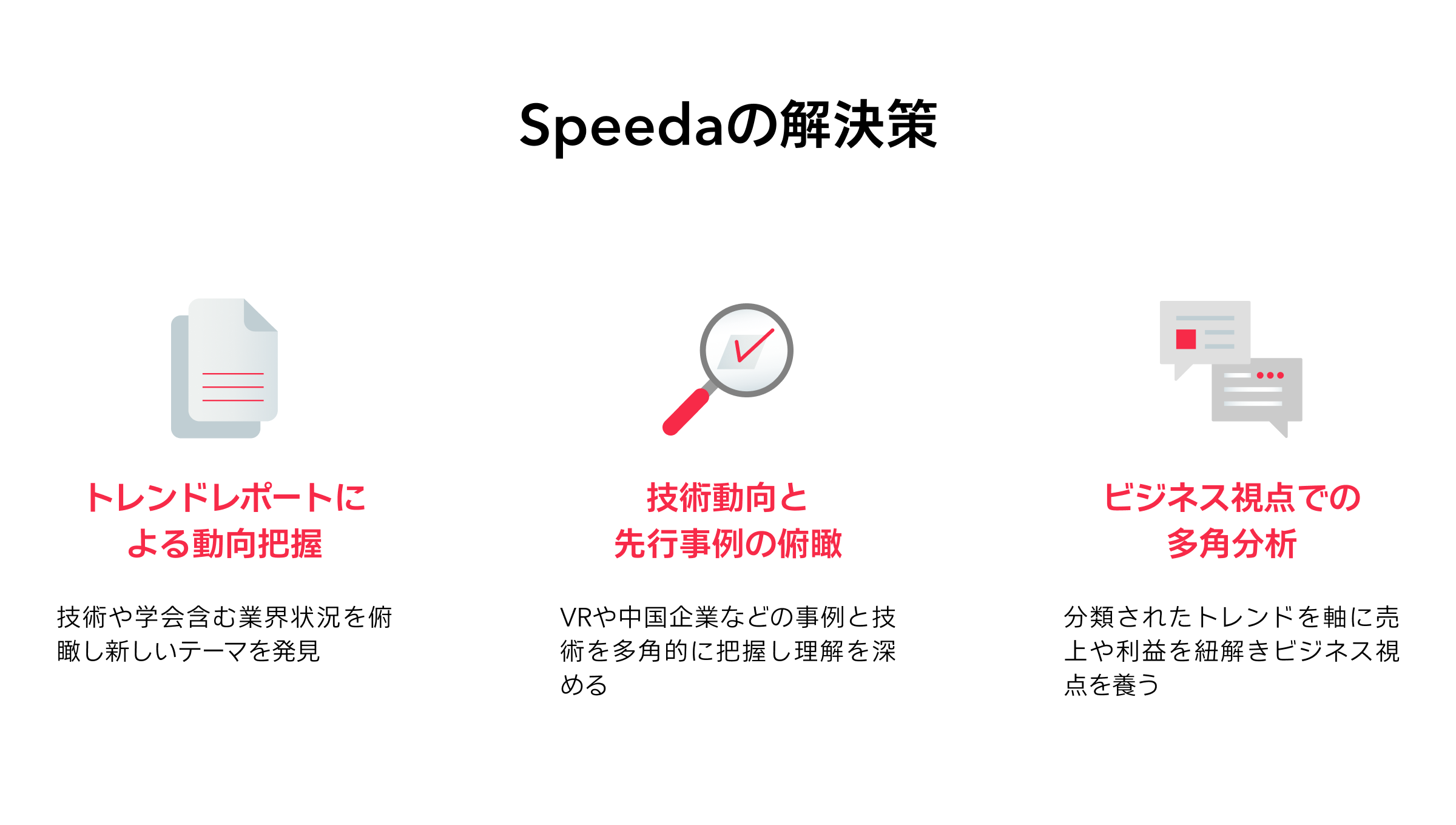 徐様:最も活用しているのは、トレンドレポートです。技術や学会の動向も含めた業界全体の状況を見ることで、新しいテーマを発見する切り口を見出せます。 スピーダのレポートは、ロジックに基づいてストーリー仕立てでまとめられている点が大きな特色だと思います。ロジカルなレポートのまとめ方のおかげで、難しい技術のメカニズムも非常にわかりやすいですね。 最近調べたのは、スマートスピーカーやVR/ARの領域です。メーカーごとの製品比較や技術のメカニズム、マネタイズの仕方までひとつにまとめられています。レポートの内容だけでなく、レポートのまとめ方も、非常に参考になりました。 中国の企業についてリサーチするときは、中国語の資料と同時にスピーダの情報も合わせて読み込むことで、多角的な視点で企業を知ることができますね。