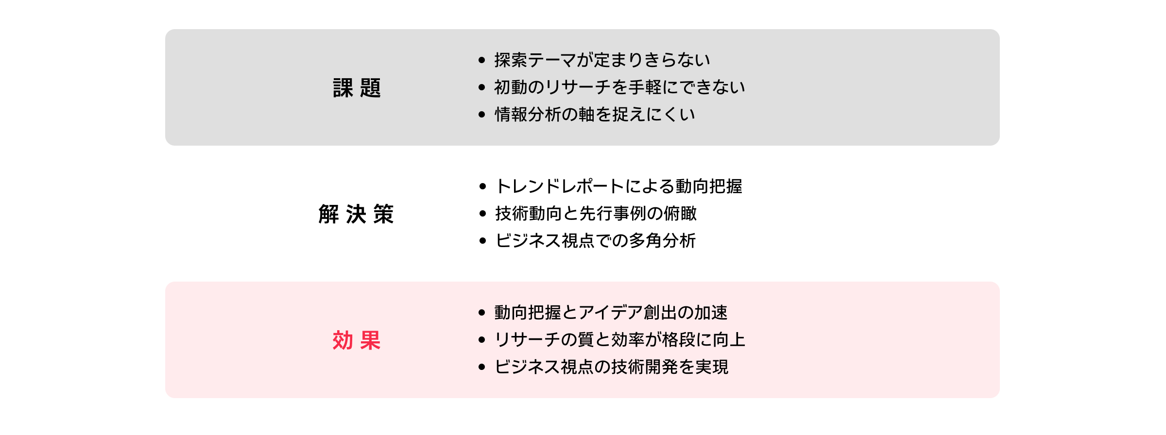 笹井様:新しいビジネスを考えるとき、その分析の「軸」を考えるのがとても時間がかかるんです。そういうときに、スピーダのトレンドレポートで分類されているトレンドやそこでまとめられている内容を見ることで、分析の軸を捉えられるところがありがたいですね。 もしスピーダがなければ、情報収集はできても集めた情報をどのような軸で分析し活用に繋げていけばいいのか、探索のヒントを得ることまでできなかったように思います。