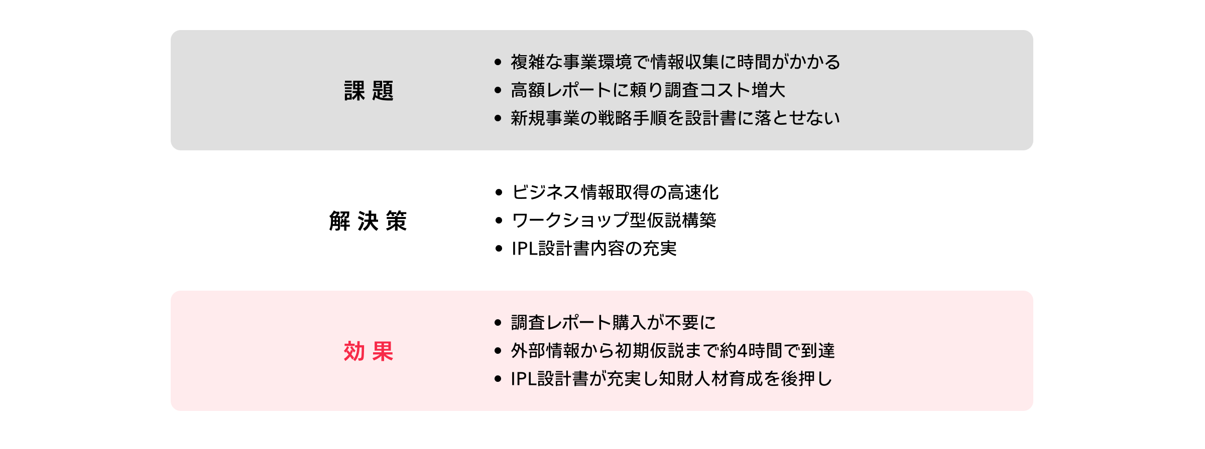 そもそも知財担当の私からすると「新規事業を立ち上げる」と聞いても、どのような情報が必要なのかよくわからず、必要な情報にすぐたどり着けませんでした。事業の複雑性が増している分、調査前に仮説を立ててもそれ自体が検討違いの場合もあり、仮説検証のスピードをもっと上げたいと考えていました。