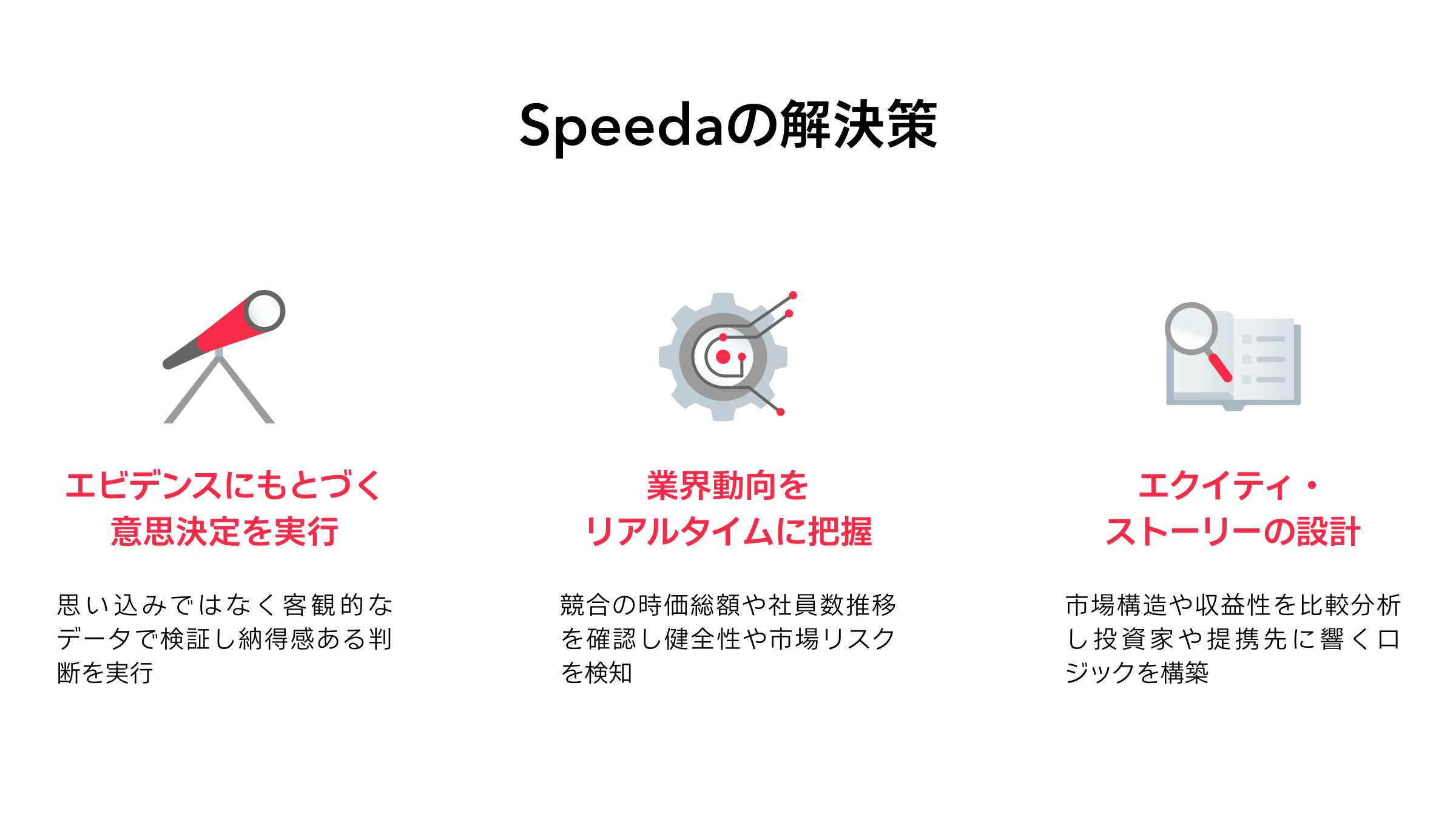 基本的に、意思決定に迷ったときは「Speedaに聞く(調べる)」という形を取ります。用途は大きく3つあります。