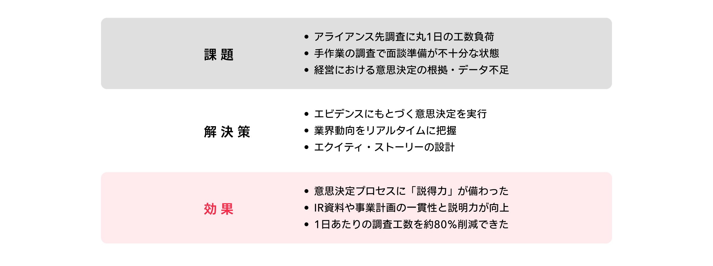 また、情報収集の効率にも明らかな変化がありました。従来Speedaで取得していたレベルの情報を自力で調べようとすると1社あたり丸1日かかっていたところ、Speedaなら1〜2時間で完了します。1件あたり75〜88%の工数削減になり、本来集中すべき検証や戦略設計に時間を割けるようになりました。