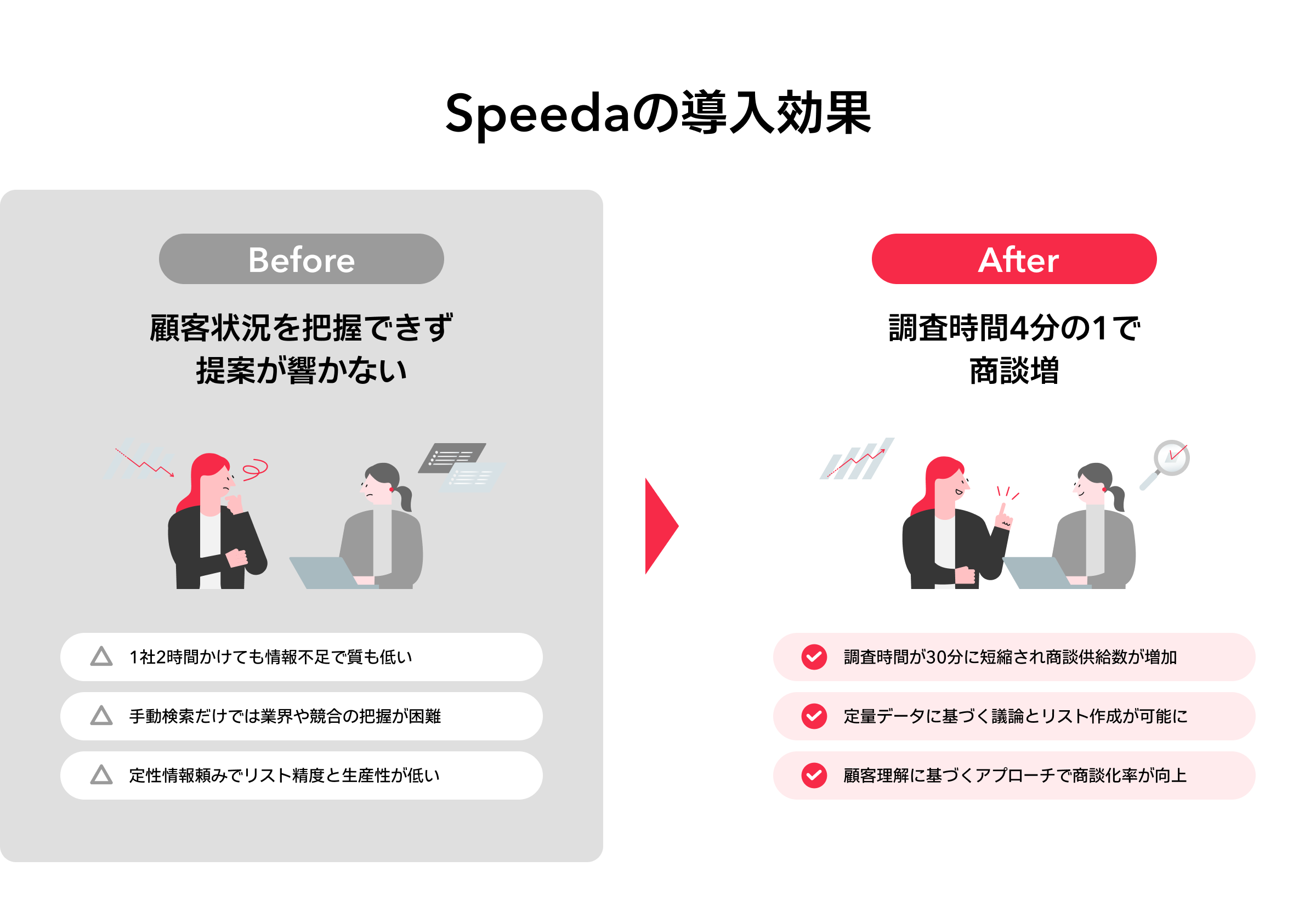 成田様:スピーダ導入前は1社あたり2時間ほどかけて調査していました。まず、企業のホームページを確認し、事業概要や採用のページから情報を収集します。それだけで情報が足りない時は、競合企業を調べなければなりません。 ところが、企業がどの業界に属するのかを調べるだけでも大変で、それが分かった後に競合企業を探し出すのも一苦労。競合企業が上場企業であればIRからも情報を収集します。 これだけ時間をかけておきながら、「実際に企業へアプローチしたら話を聞いてもらえなかった」ということがよくありました。