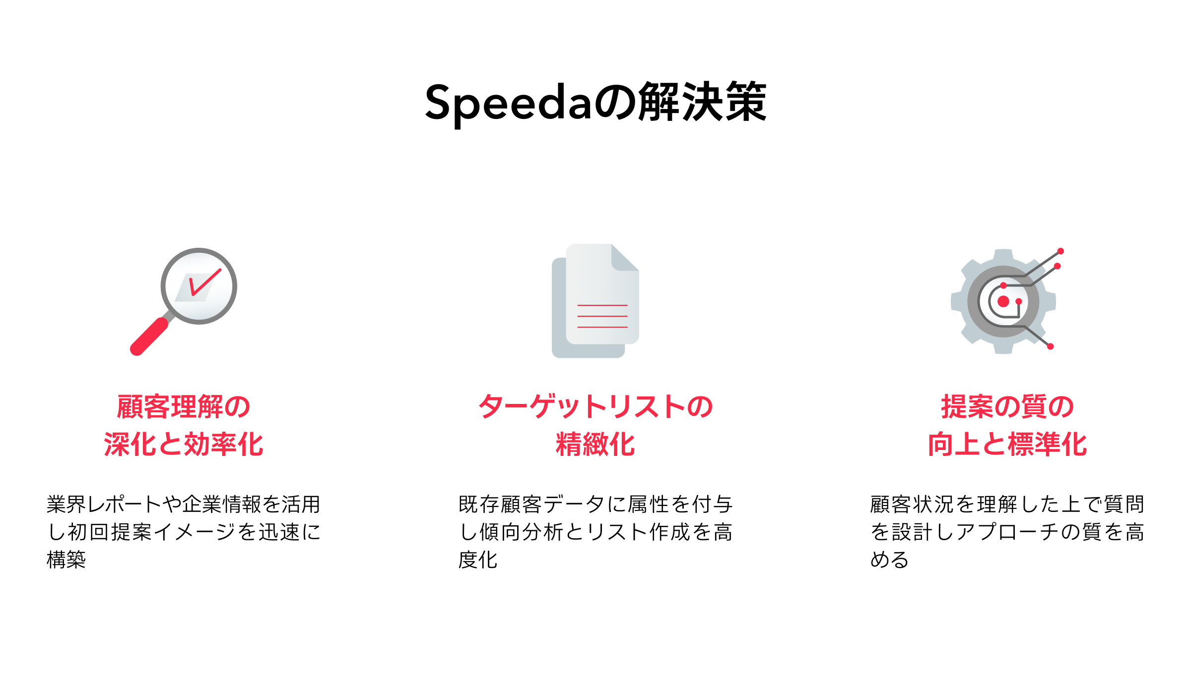 当然、弊社の提案がお客様の状況をきちんと理解したものでなければ、経営層の方々は私どもの話に興味を持たれません。逆に、弊社の提案がお客様の置かれた状況を理解した上でのものであれば、「この人たちの話を聞いてみたい」と思っていただけると考えました。 スピーダを導入する以前からインサイドセールス部門では、お客様へアプローチする時に、お客様の状況をしっかりと理解した上でアプローチするように心がけておりました。ところが、私のチームは中小・中堅企業を担当していることもあり、webなどから得られる情報が多くありません。