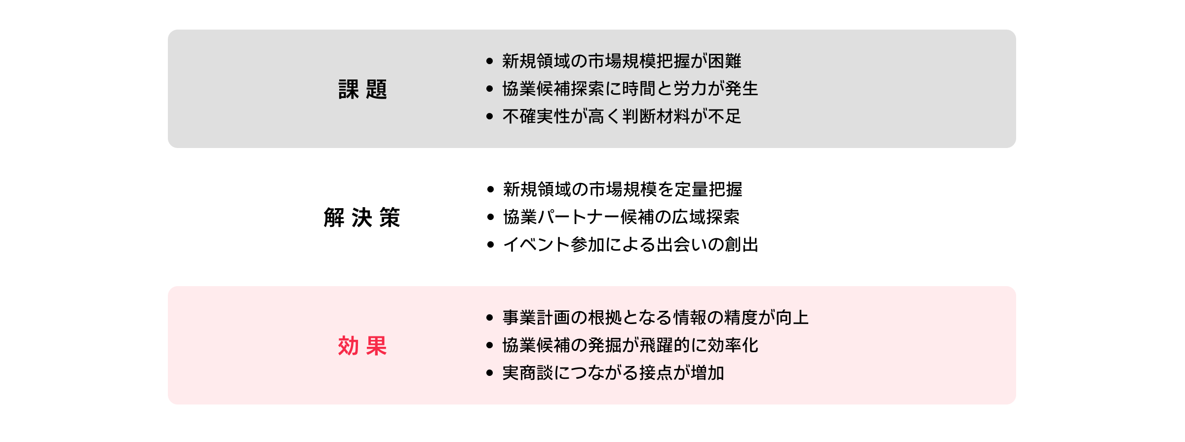 これらの課題を解決し、効率的に情報収集や協力会社探しを行う目的で、スピーダの導入を検討しました。特に、事業計画を作成する上で、新しい領域の市場規模をどのように算出し、経営層に説明するかは常につきまとう課題であり、その解決策としても「スピーダ 経済情報リサーチ」に期待しました。