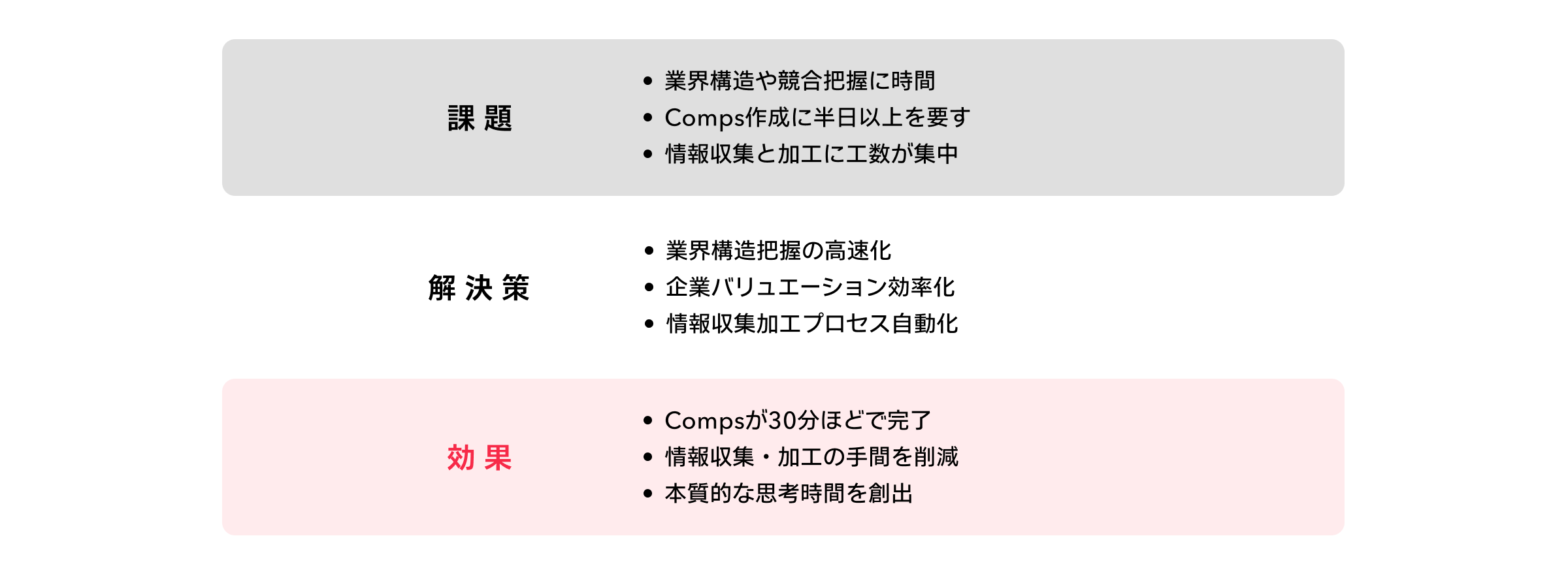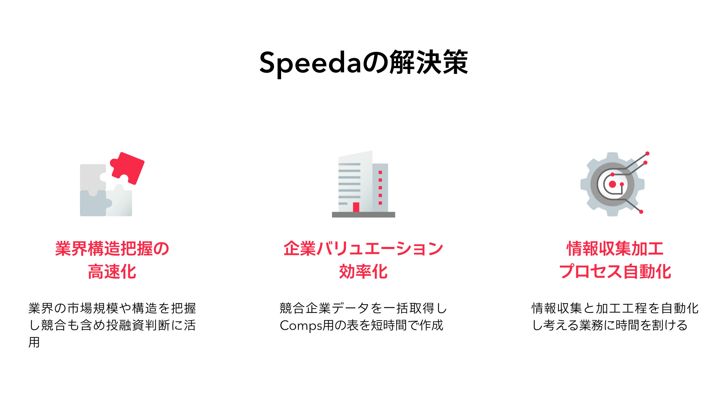 田中様:投融資を検討する初期段階では、まず、ベンチャー企業がどの業界に属するのか、その業界の市場規模・構造・バリューチェーン等はどうなっているか、どういう企業が競合なのか、を把握する必要があります。そこでスピーダの出番です。