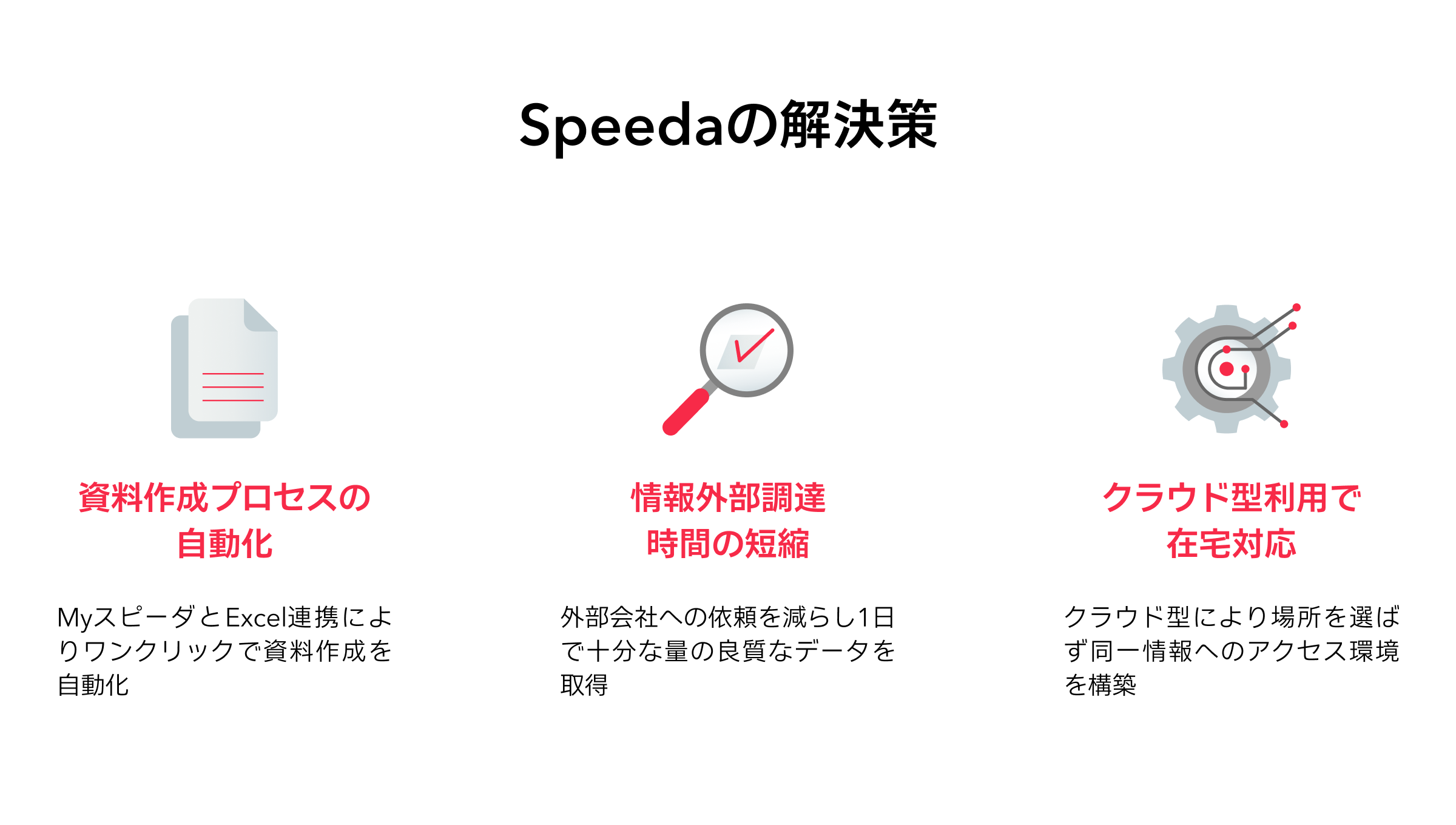 島田様:数字で表すのは難しいですが、情報を集める仕事から解放され、付加価値を生む仕事に集中できるようになったと実感しています。一般的に、情報収集の仕事は付加価値を生むものでは無い。集まったデータから何かを導き出すことで初めて付加価値が生まれる。そこにスピーダの大きな価値があるのかもしれませんね。