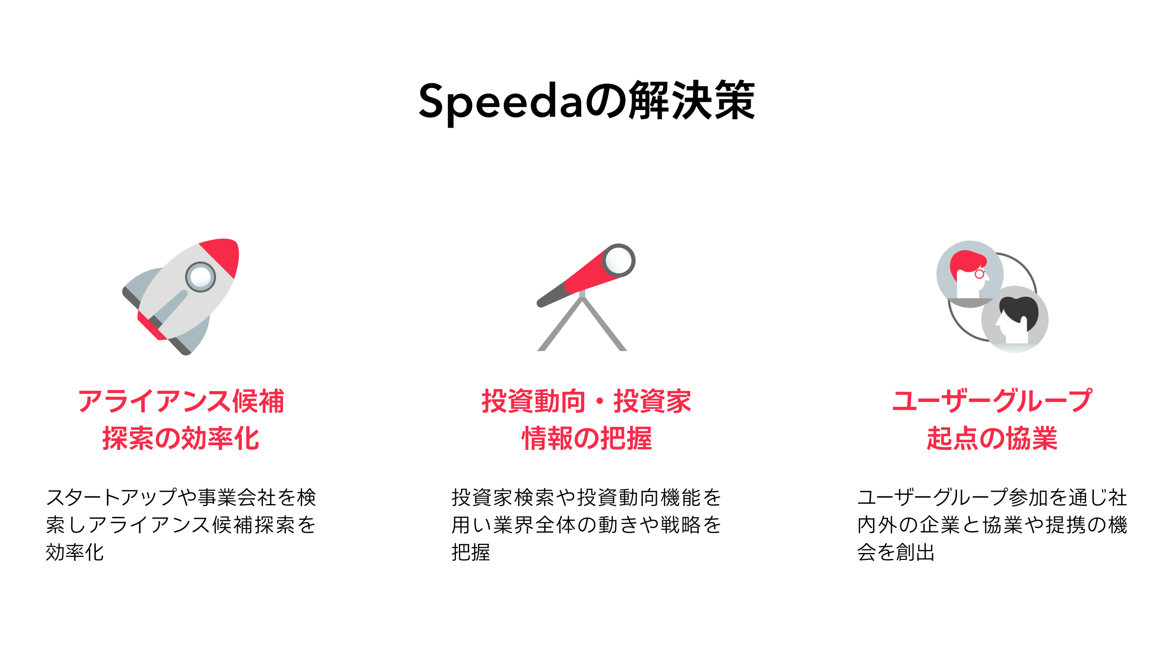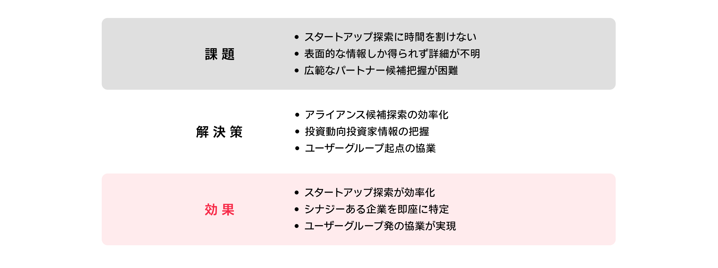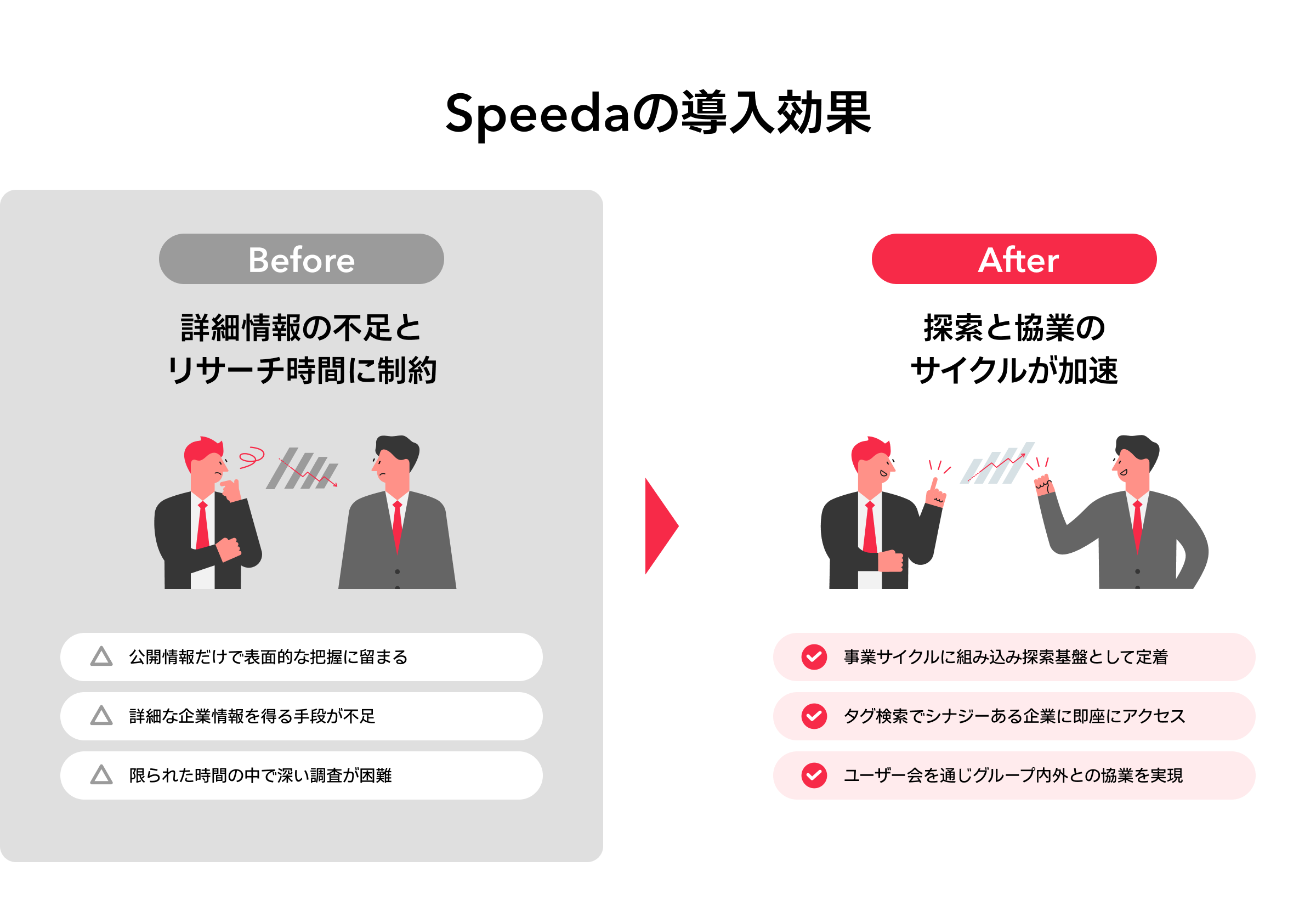 スピーダ スタートアップ情報リサーチは私たちのスタートアップソーシングにおける事業サイクルに組み込まれており、新しいアライアンスパートナーを模索する際には欠かせないツールとなっています。