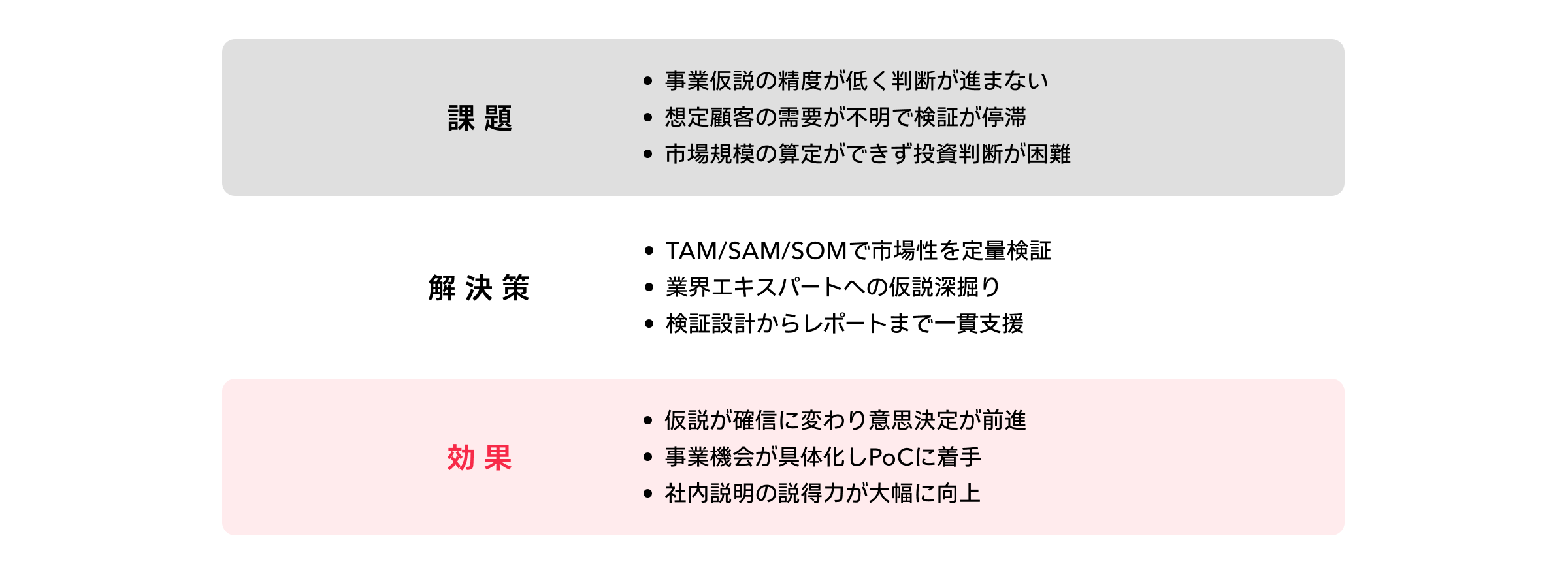 野田氏:我々が持っていた企画アイデアに対し、「本当にニーズはあるのか」「市場性はどれくらいか」という点を、客観的な情報で検証していただくことを期待していました。特に、市場規模をTAM/SAM/SOMのような具体的な数値で把握したかったのです。
