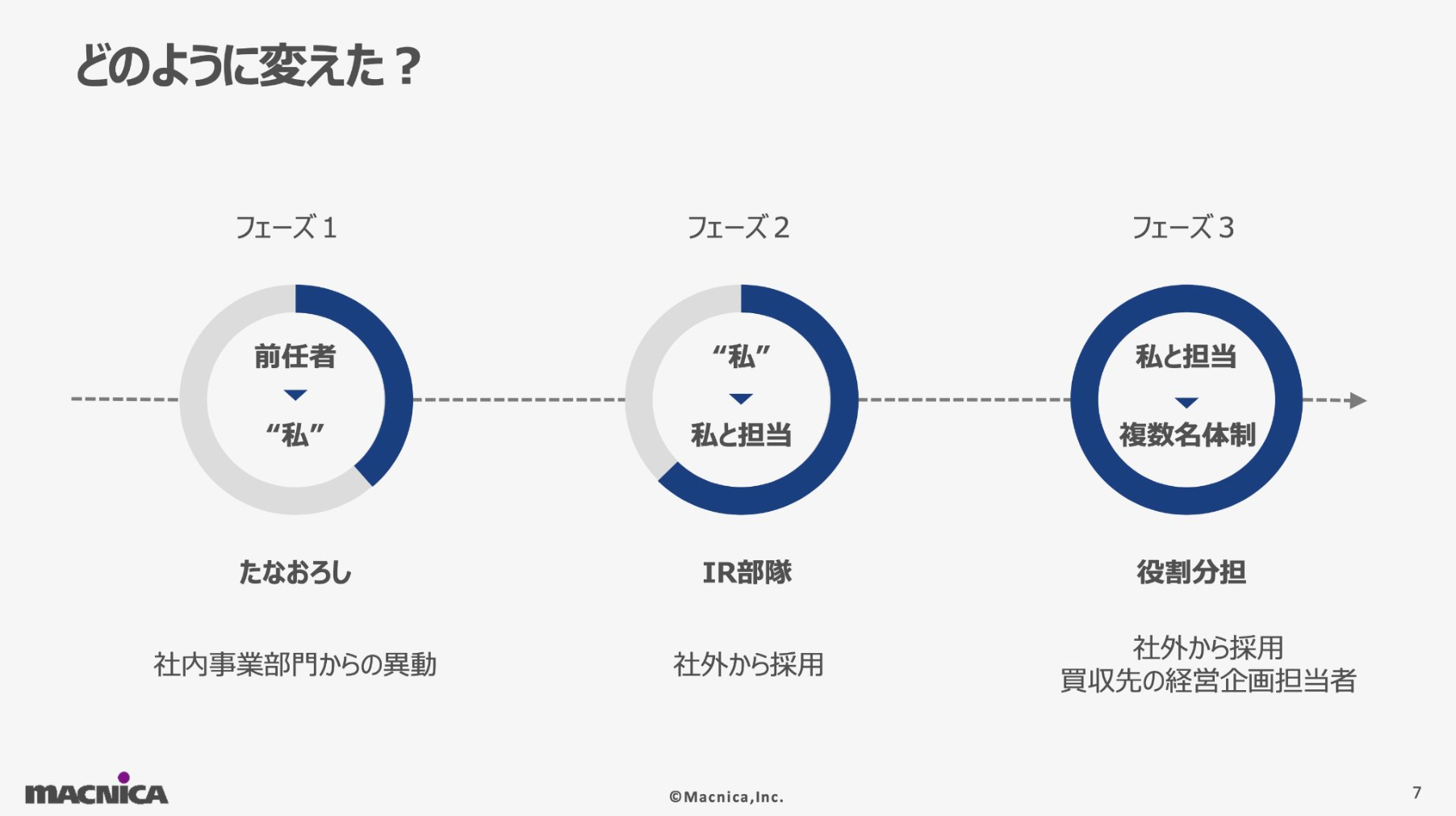 そしてフェーズ3が現在の体制です。さらに1名採用し、加えて買収先の経営企画部門から2名が合流し、5名体制となりました。人数が増えたことで、投資家との関係構築を担うチームと、開示資料作成などを担うチームという形で役割分担を明確化しました。これにより専門性が高まり、メンバーが自律的に業務改善を進められるようになっています。ここから1人が異動し、現在は私を入れて4名の体制です。