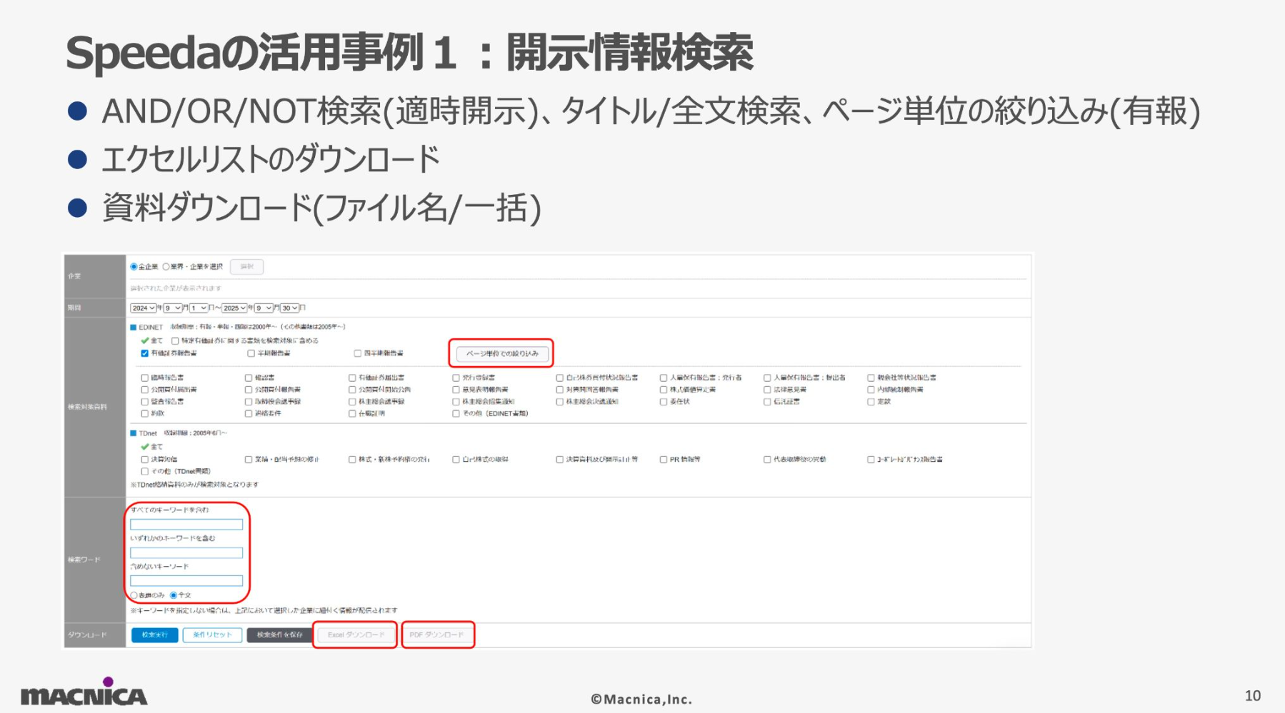 古賀 氏:私自身、Speedaを見ない日はないくらいのヘビーユーザーです。具体的な活用法を3つご紹介します。1つ目は「開示情報の検索」です。開示資料そのものを検索して閲覧する時もありますが、より分析的な観点でも利用しています。Speedaの機能だと、適時開示資料のタイトルだけでなく、本文までAND/OR/NOT検索ができるので、例えば「統合報告書を日英同時開示している企業」を探そうとした時に、様々なキーワードを駆使した特定の条件で市場全体や他社の動向を調査できます。さらに、開示情報をExcelでダウンロードし、業種や時価総額などのデータを紐づけて分類ごとの傾向を把握しています。「どの企業が、どれくらいのスピード感で、どのような開示をしているか」を統計的に分析できて、IR戦略の立案に活用できることが非常に大きいです。
