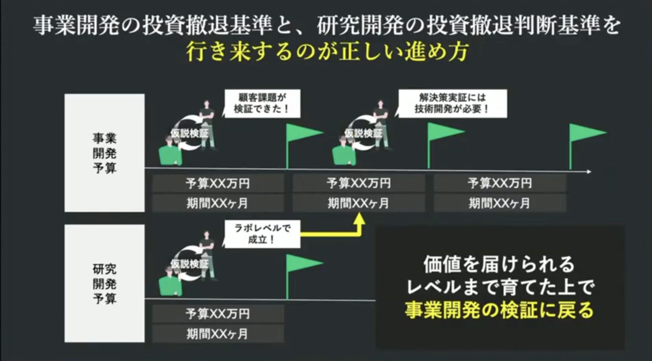 つまり担当者の提案や事業案に対して「事業開発」と「技術開発 / 研究開発」の論点が混在してしまっているだけでなく、そもそものGo / No Go判断の基準がないため、投資撤退の意思決定ができないのです。