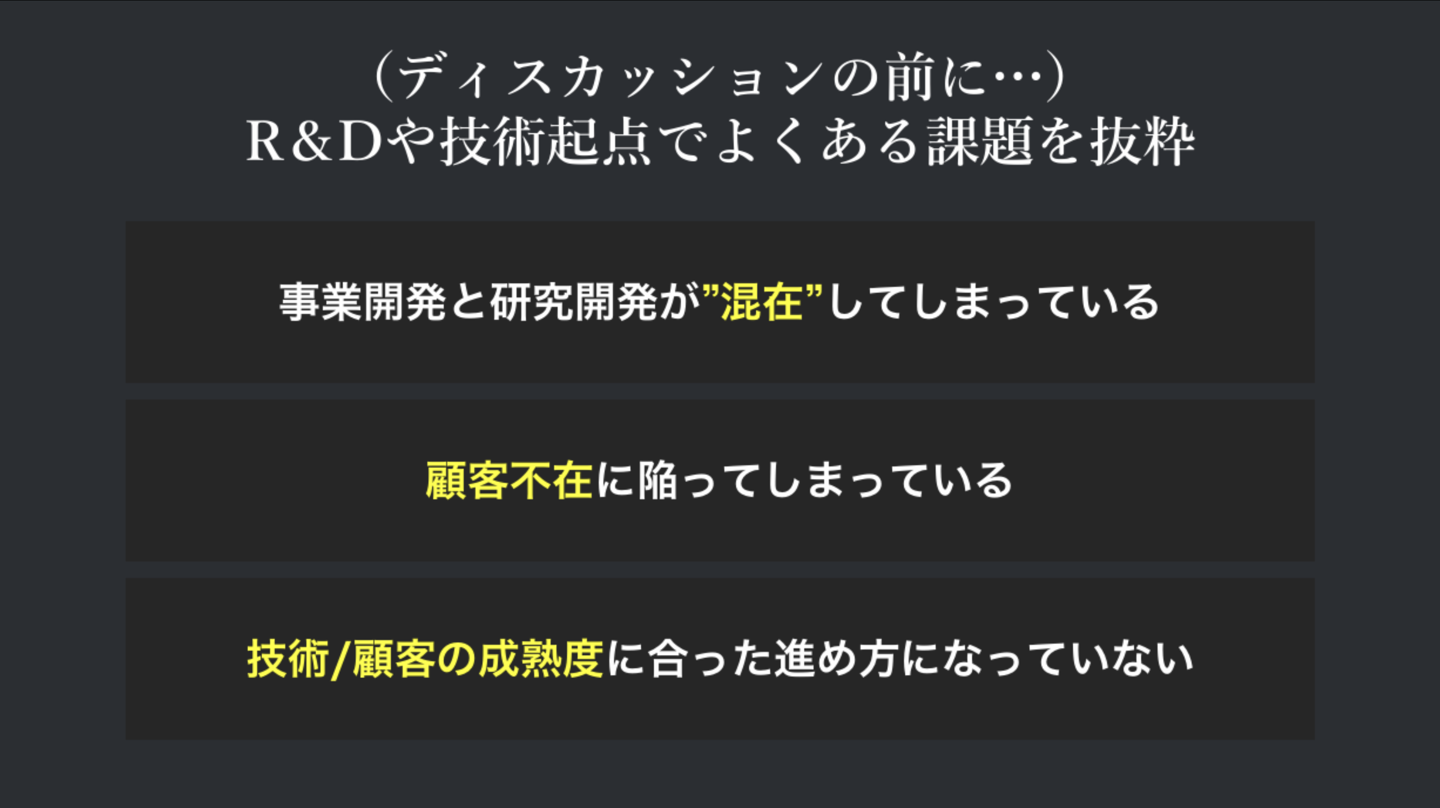 土井氏:まず、R&D起点の新規事業開発でよく起こる課題について整理したいと思います。私が多くの企業を支援する中で見えてきた3つの構造的問題があります。