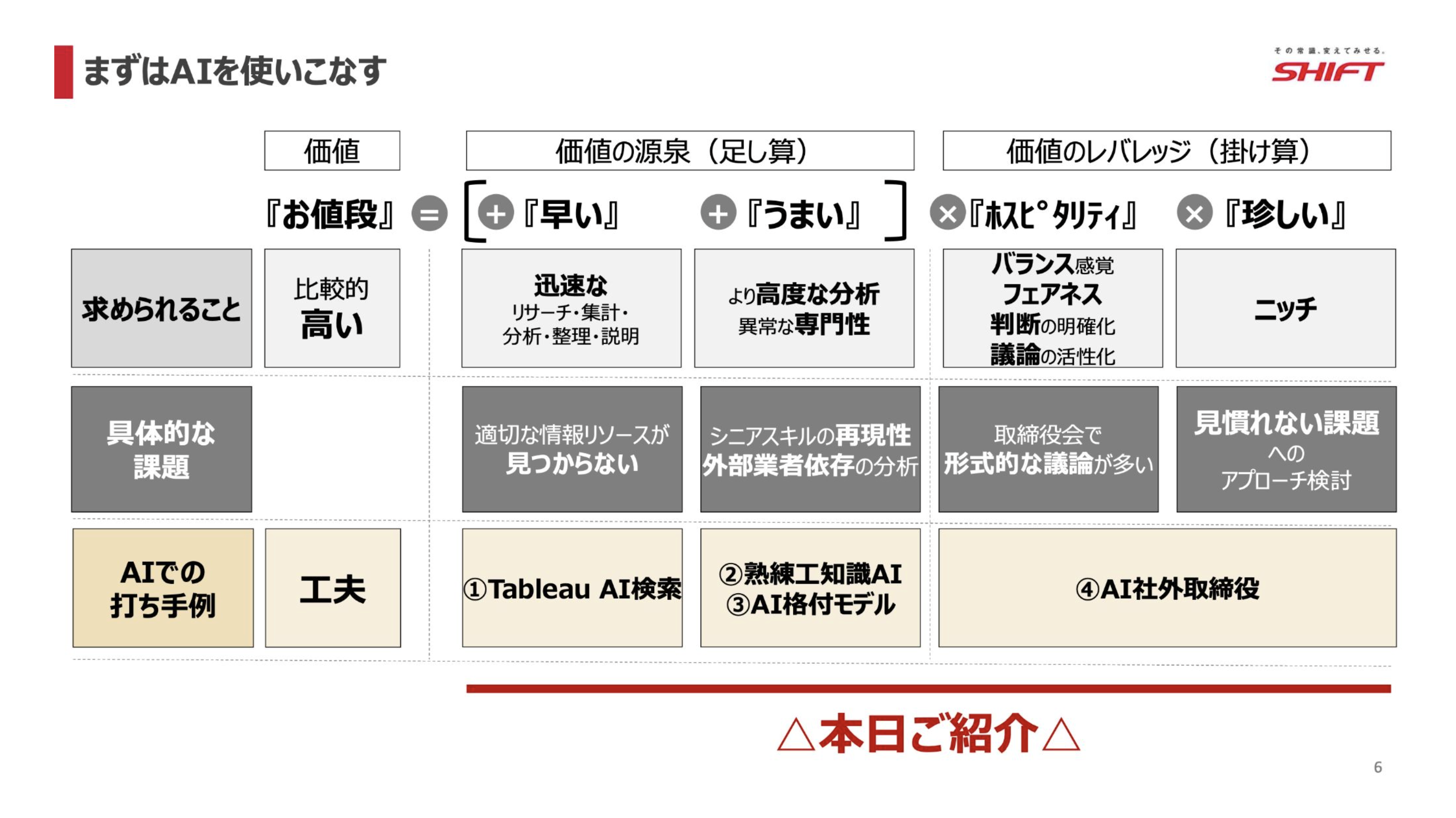 私たちは、これら4つの要素を「(早い + うまい)× ホスピタリティ × 珍しい」という方程式で捉え、この価値創造プロセスにAIを組み込んでいます。本日は、これらの課題に対してAIをどのように活用し価値を届けているのか、社内向けツールに組み込んでいるのか、その具体的な事例をご紹介します。