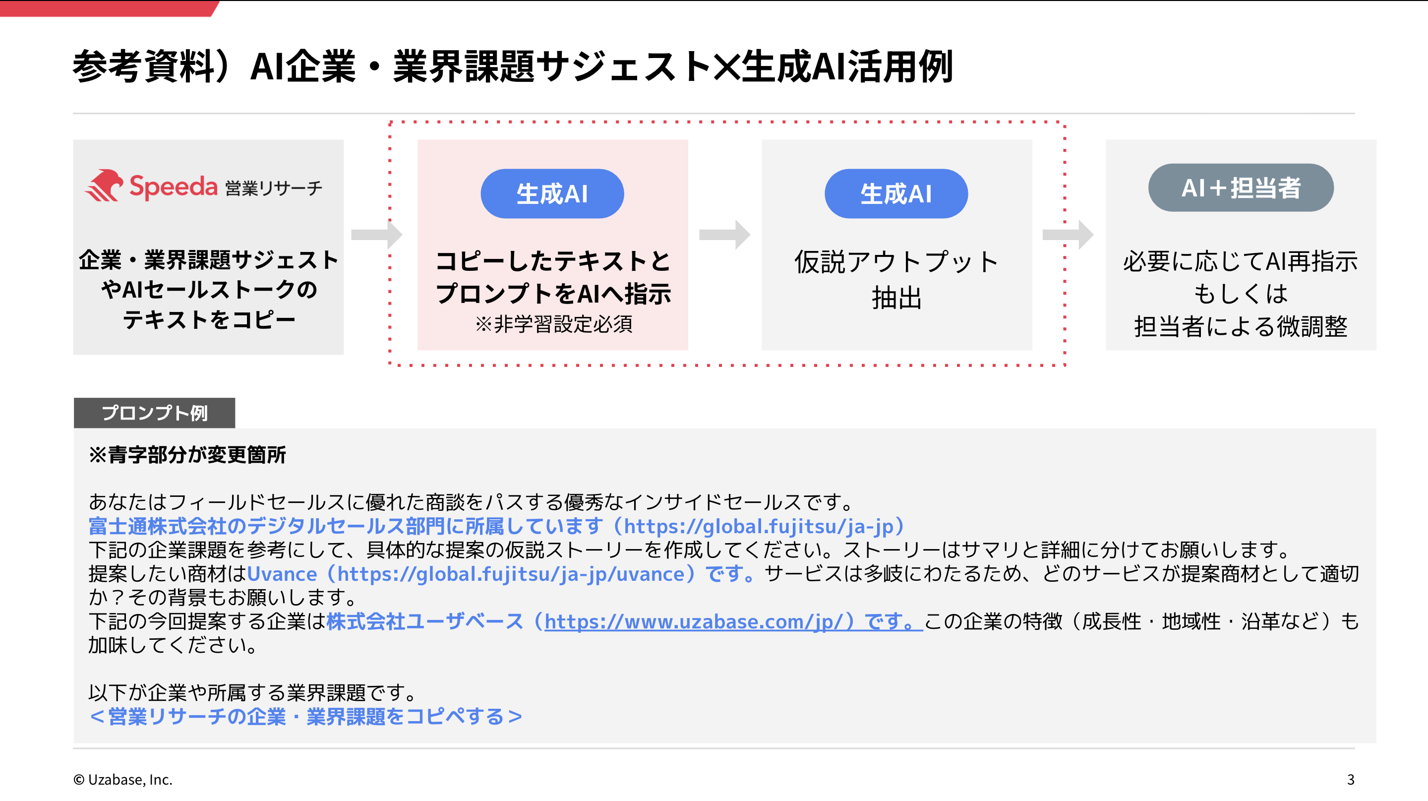 新野氏 中期経営計画など正確性の必要な情報はSpeedaで確認し、1to1メールの作成やより詳細なトークスクリプトの作成に汎用的な生成AIを活用しています。「AI課題サジェスト」で得た企業課題を生成AIに入力し、「この課題を持つ企業の〇〇部にコールするトークスクリプトを作って」と指示すれば、その企業の状況に応じたメール文面やトークスクリプトを短時間で作成できます。
