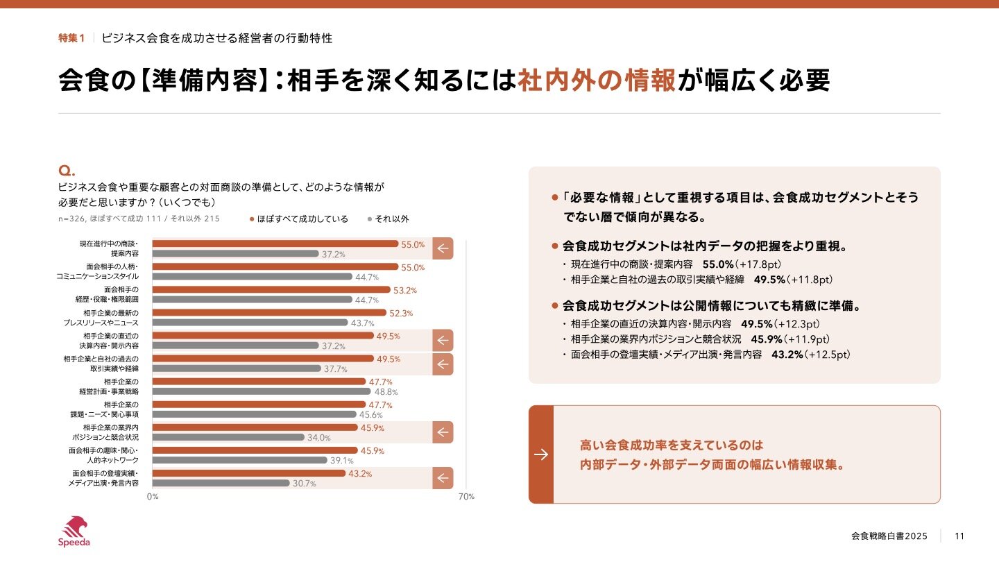 ・内容・話題: より「幅広い話題」を用意し、社内データ・外部データ両面の幅広い情報収集(例:現在進行中の商談・提案内容、相手企業の業界内ポジション、面会相手の登壇実績など)を行っている