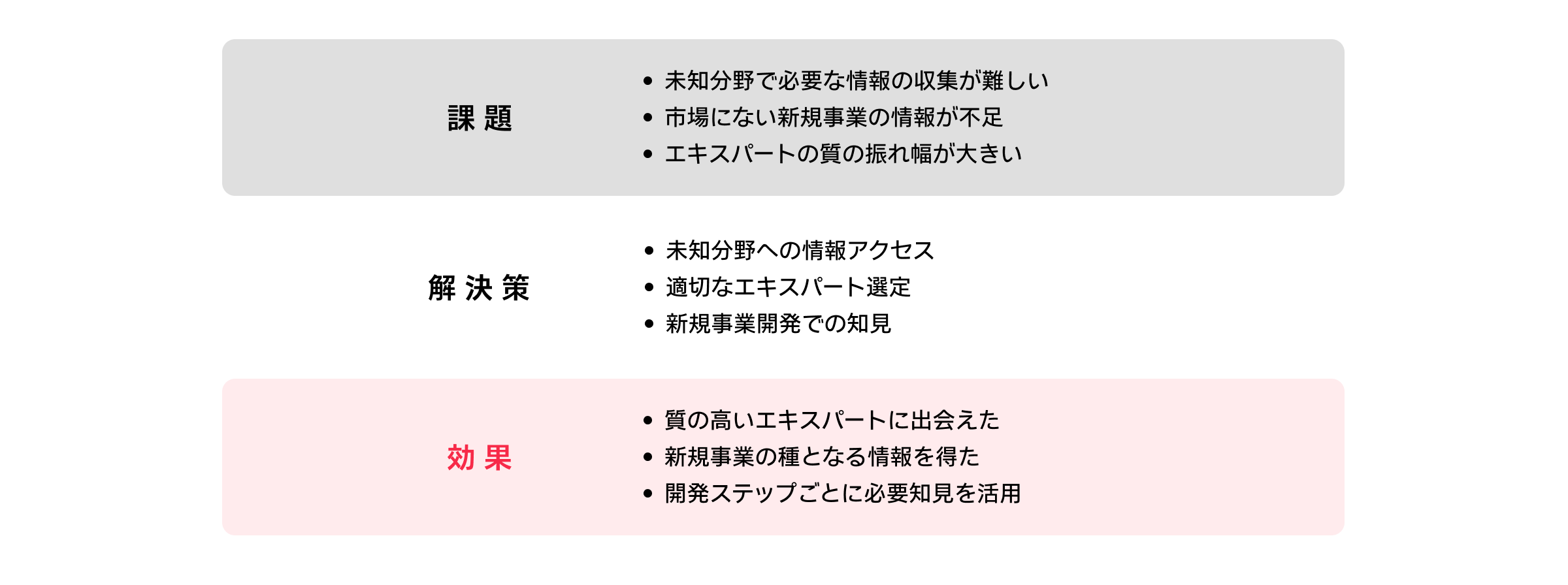 私どもはまだ市場が存在しない分野の新規事業を模索しているので、「それに近しい経験がある」方のリストをもらうだけで開発のヒントになることがあります。