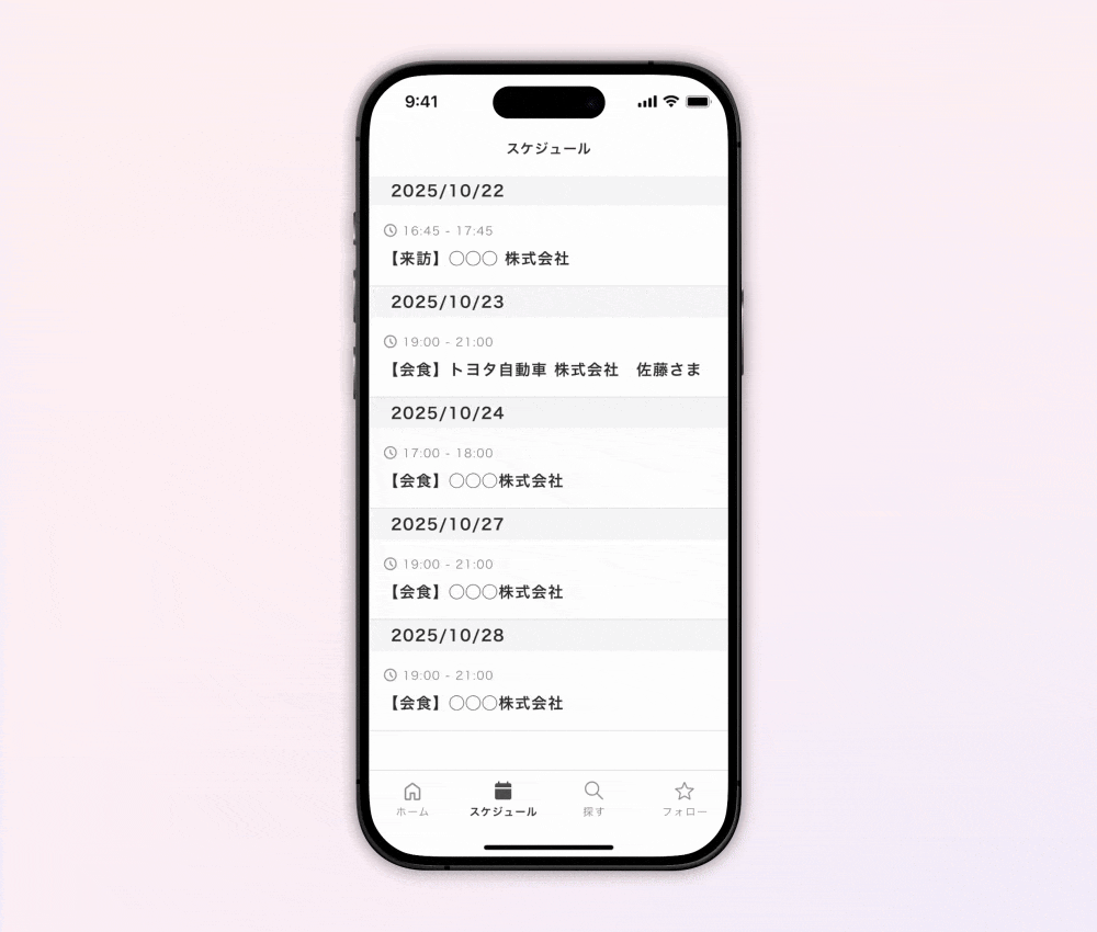 - カレンダー連携により自身の予定に関係する企業・人物の情報を自動で紐づけすることで、会食や商談に必要な情報をタイムリーかつ自動で取得可能。会食・商談の予定に合わせたプッシュ通知により、必要なタイミングで必要な情報を届けます。
