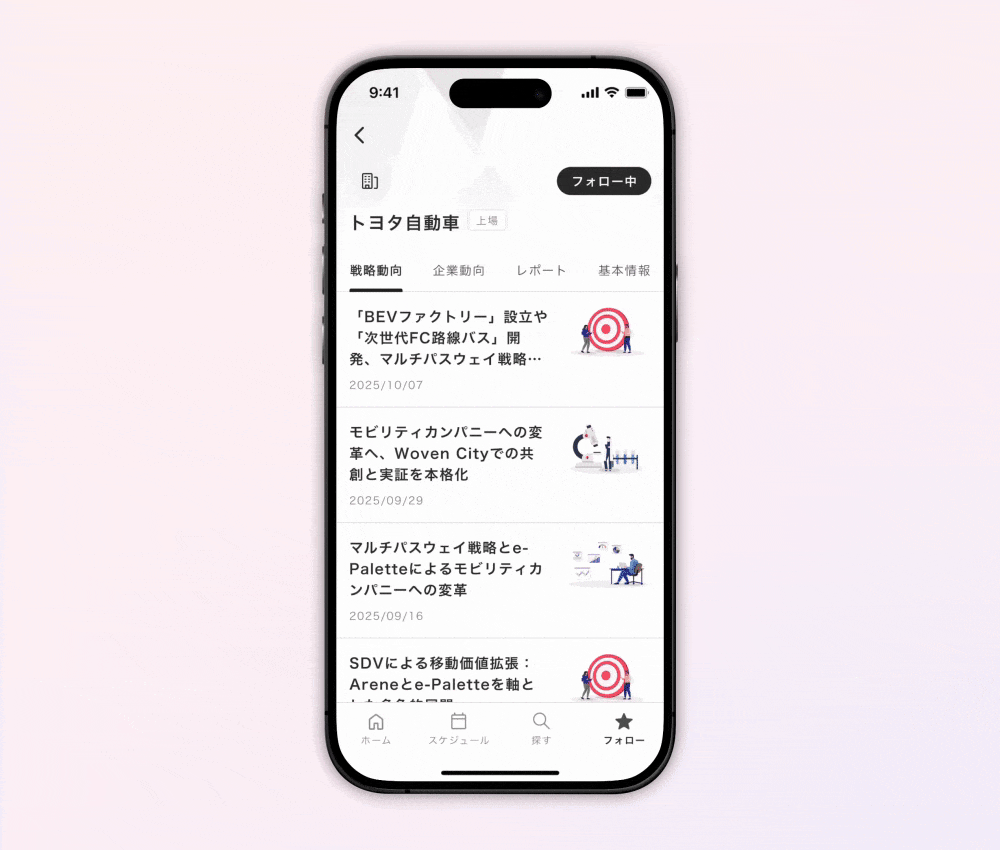 - 企業をフォローすることで、関連するプレスリリース等をタイムライン上でクイックに確認できるほか、毎日の通知により重要顧客に関する情報収集を習慣化することができます。