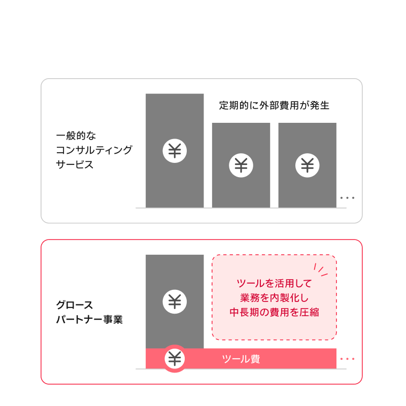 - 「自社で課題を解決できる力」を養うことで、継続的な外部コンサルタントの関与費用を最小限に